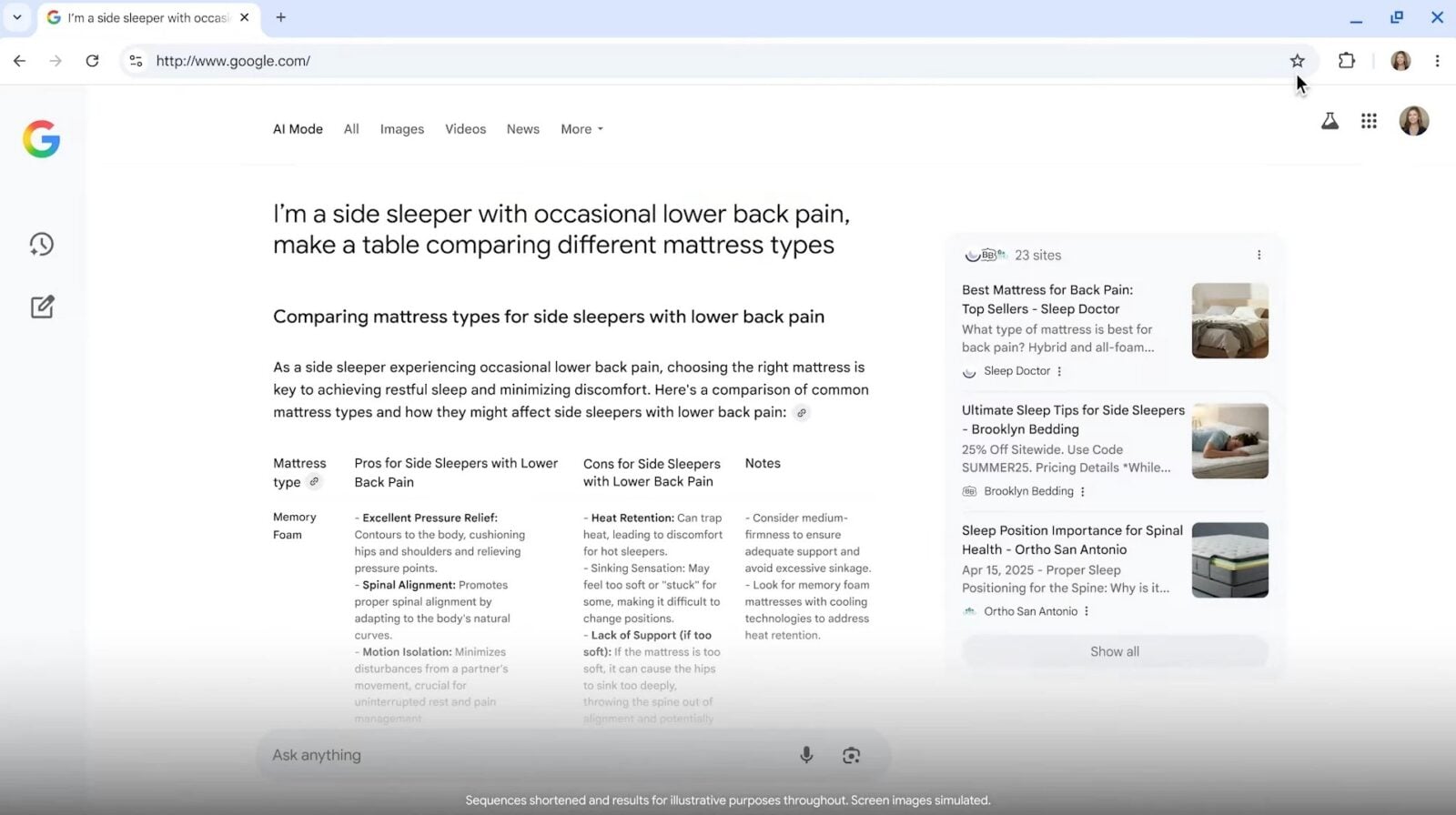 Dodatkowo, pasek adresu w Chrome (tzw. omnibox) zyska nową funkcję AI Mode. To ulepszona wersja AI Overviews, która radzi sobie ze złożonymi, wieloczęściowymi pytaniami, oferując odpowiedzi w bardziej konwersacyjnym stylu. Pojawią się również kontekstowe sugestie wyszukiwania. Przeglądasz stronę z materacami? Omnibox może zasugerować, by zapytać o “Politykę gwarancyjną”.