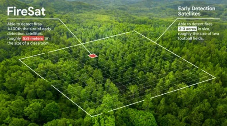 Google Research, wraz z ekspertami straży pożarnej, chce stworzyć FireSat, specjalnie zbudowaną konstelację satelitów zaprojektowaną specjalnie do wykrywania i śledzenia pożarów lasów tak małych jak klasa (około 5×5 metrów). Da to władzom obraz o wysokiej rozdzielczości, aktualizowany globalnie co 20 minut, a to pomoże im reagować na pożary na tyle szybko, zanim jeszcze staną się destrukcyjne. Na rozpoczęcie tych prac Google.org przekazało 13 milionów dolarów, a zespół badawczy giganta opracował niestandardowe czujniki podczerwieni dla satelitów – we współpracy z Muon Space i Environmental Defense Fund — które mogłyby lepiej wykrywać pożary na małą skalę.