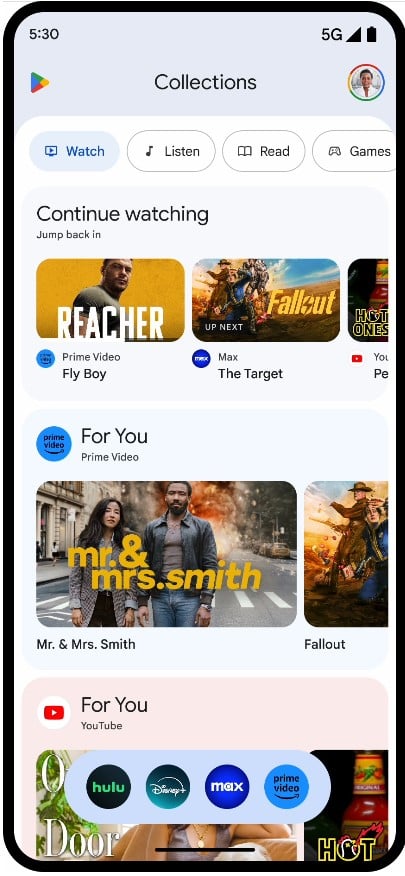 - Oglądaj – znajdziemy tam treści z platform takich jak YouTube Premium, Prime Video i inne, które subskrybujemy.