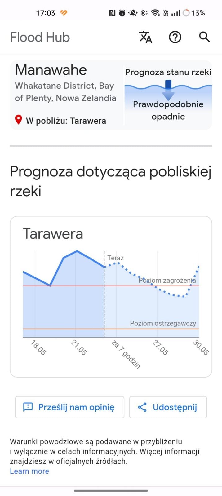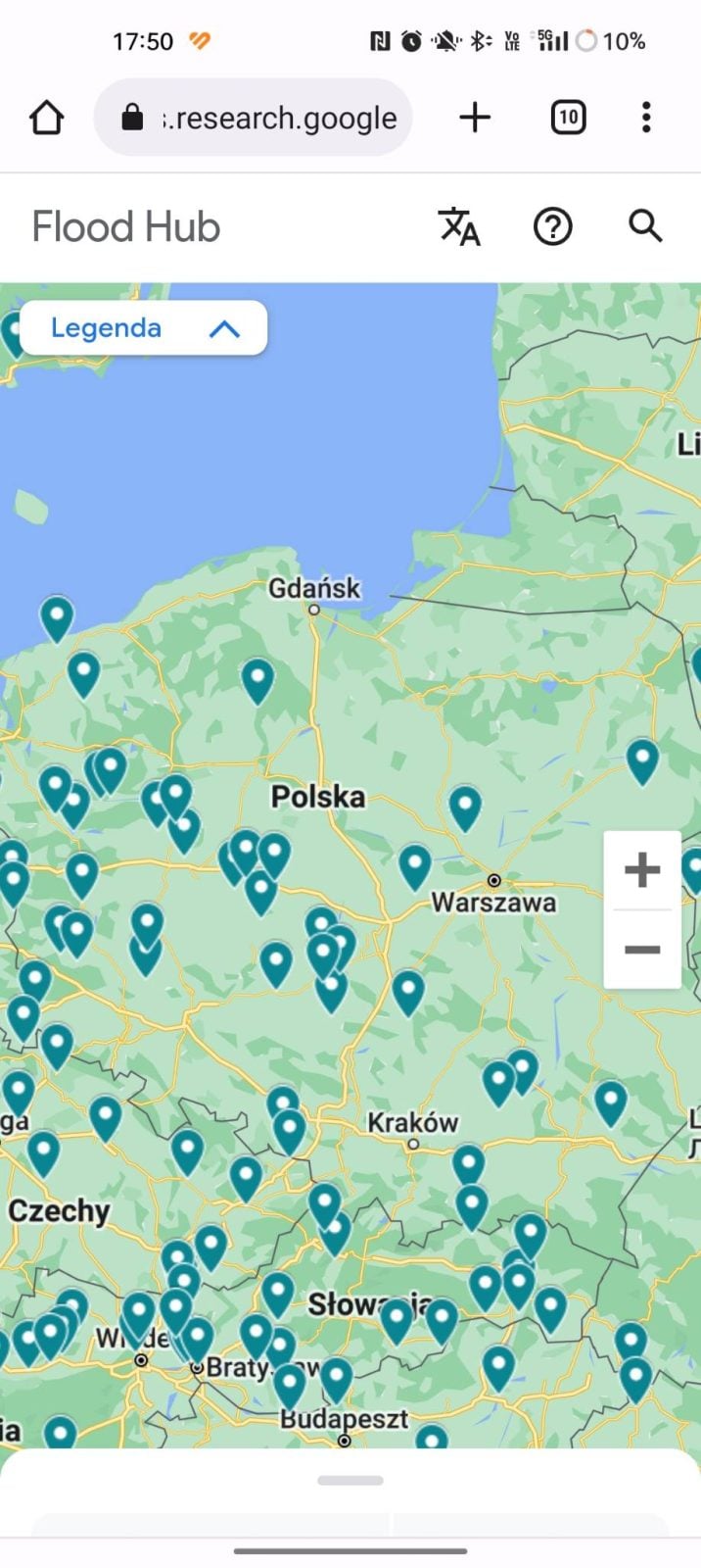 Mapę rzek i zbiorników wodnych z informacją o poziomie wód uzyskamy na dedykowanej stronie Google Flood Hub. Nie jest to narzędzie precyzyjne – opiera się przede wszystkim na wizualizacji wykresu bez osi pionowej. Widzimy jedynie dwie kreski informujące o poziomie ostrzegawczym oraz poziomie zagrożenia. Polskich punktów informacyjnych nie ma zbyt wielu. Cały rejon Warmii i Mazur zdaje się nie istnieć dla algorytmów. Podobnie rzecz ma się z mniejszymi miejscowościami. Na mapach przede wszystkim są zaznaczone punkty obok rzek, skupisk wodnych i miast znajdujących się w pobliżu. Wykresy nie pokazują dużej szczegółowości.