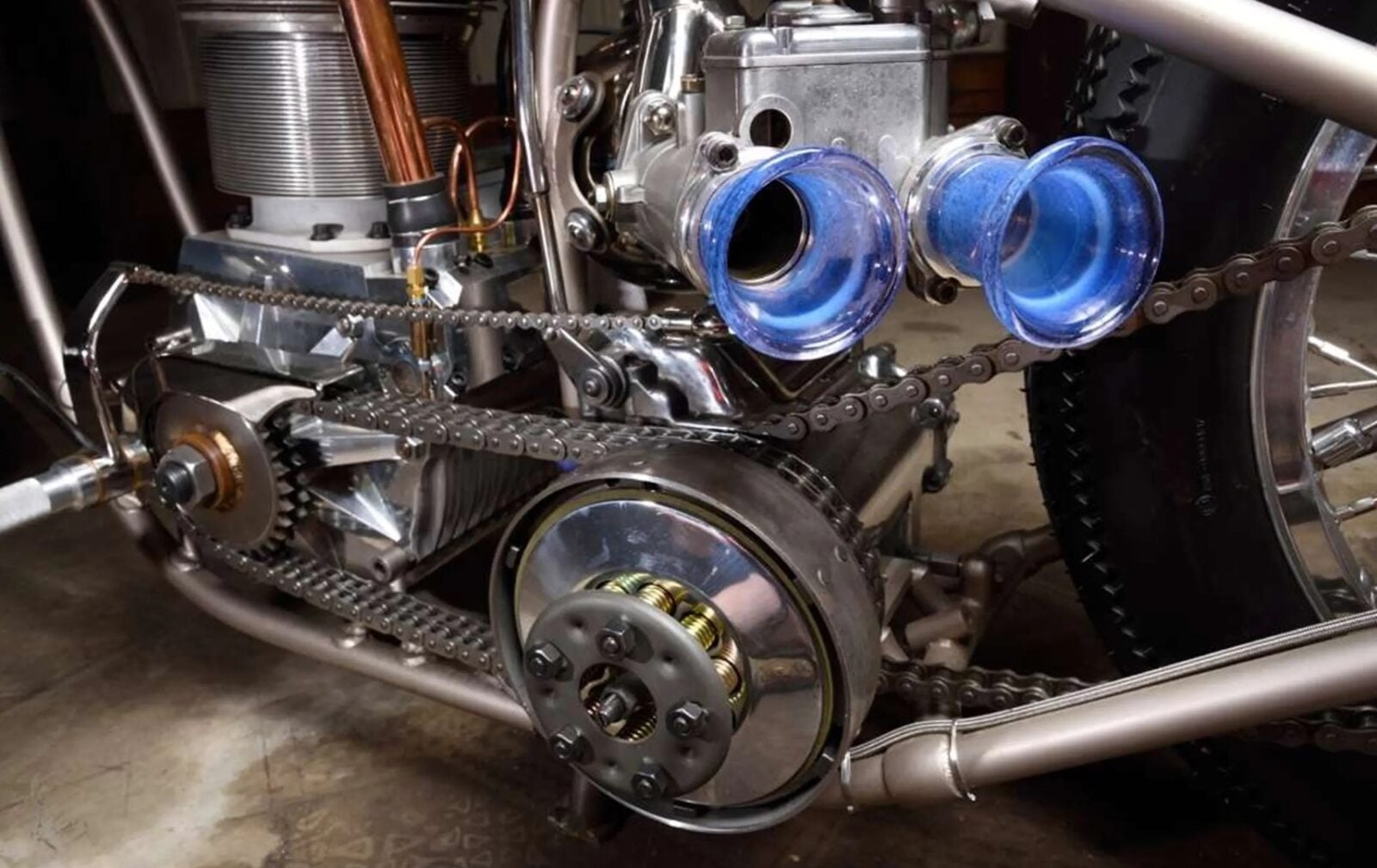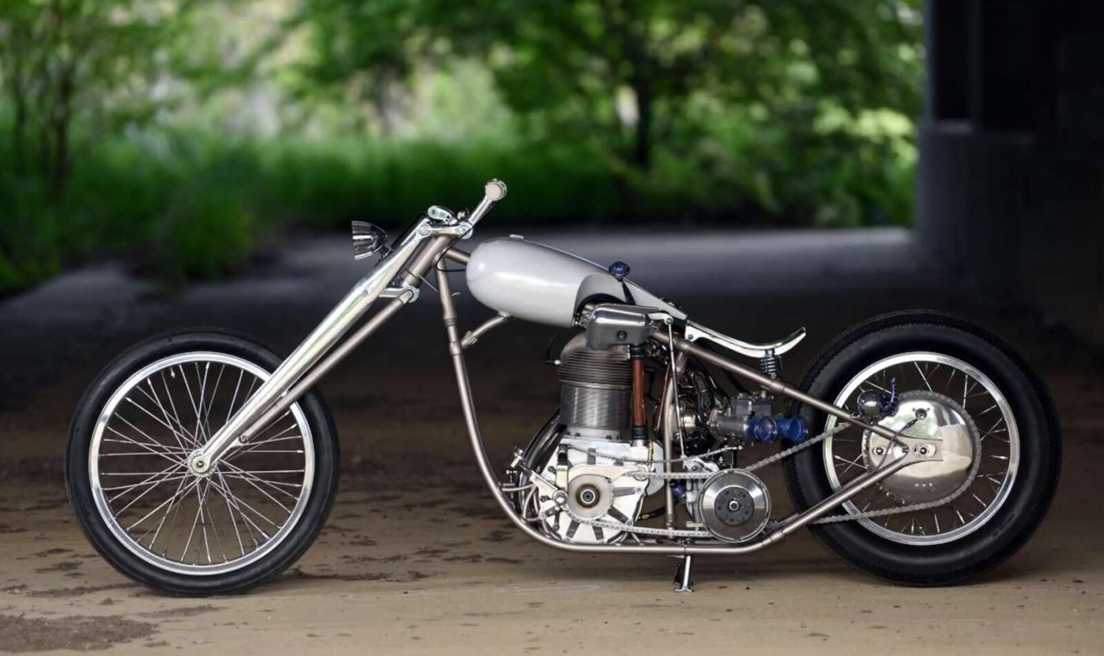 Układ napędowy Hackel-Wright Chopper to inżynierski cud, który używa serii trzech łańcuchów do przenoszenia mocy. Podwójny łańcuch łączy wał korbowy ze skrzynią biegów, pełniąc rolę napędu głównego. Drugi łańcuch przenosi moc na tylne koło, a trzeci służy jako mechanizm sprzęgła nożnego. Motocykl posiada też cztery ręczne biegi, a jedyną metodą jego uruchomienia jest zasadzenie mu solidnego kopa, ale to, co skrywa pod maską, nie jest jego jedyną wyjątkową cechą, bo Hackel-Wright Chopper to również mieszanka części z przeróżnych światów mechaniki. Przód motocykla wykorzystuje bowiem widelec Girder, wzorowany na systemie Vincent Girdraulic, czyli trapezoidalnym widelcu wprowadzonym w połowie lat 40., hamulec bębnowy prosto z Toyoty Matrix czy szereg niestandardowych elementów, za które w części odpowiada kanadyjski rzemieślnik.