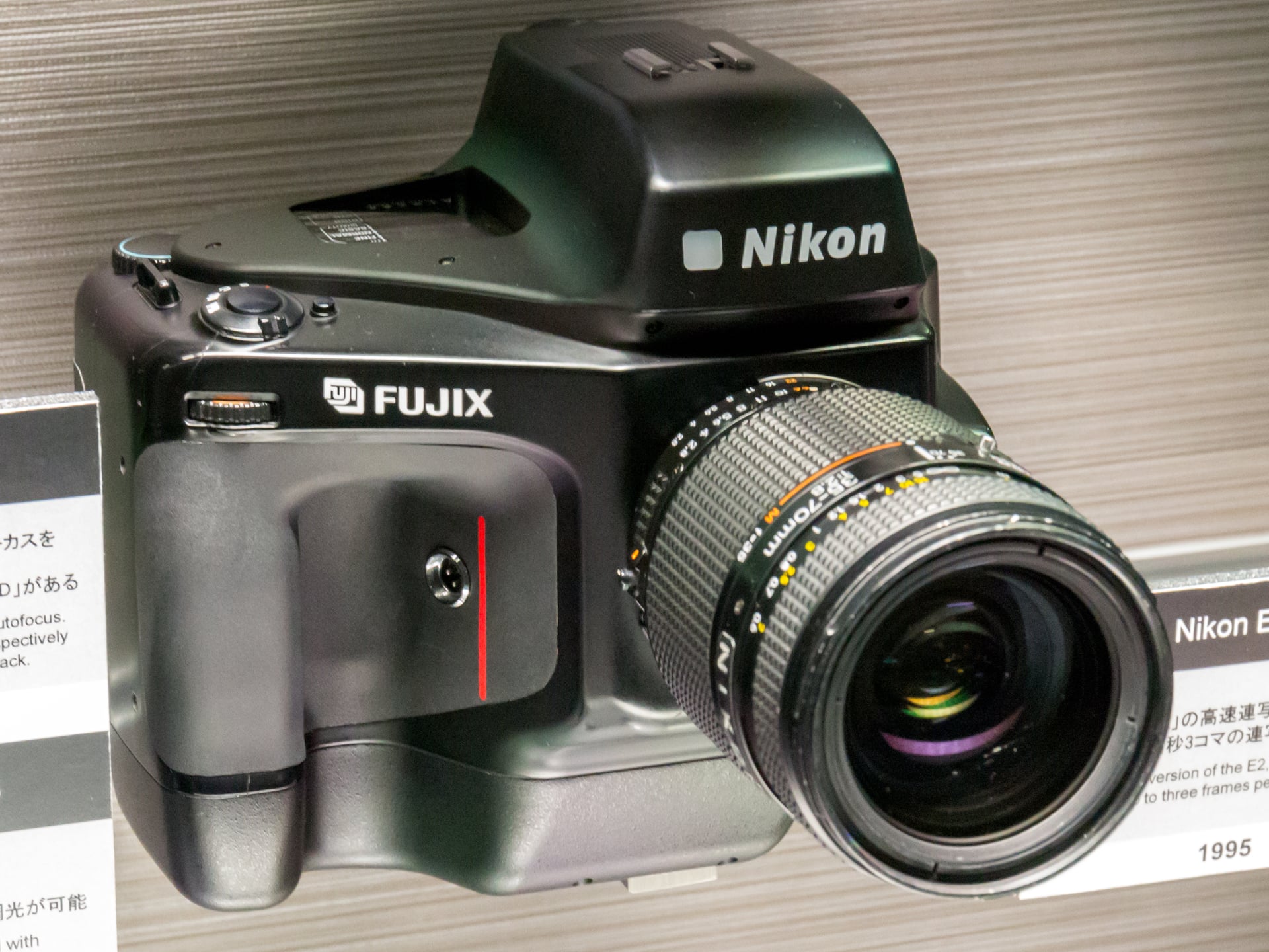 Tymczasem analogowi potentaci nie spieszyli się specjalnie z wdrażaniem nowych rozwiązań – po co, skoro ich portfolio sprzętu analogowego miało się znakomicie? W rezultacie pierwsze modele lustrzanek cyfrowych Nikona powstawały w kooperacji z Fuji – w 1994 roku Do oferty trafił pierwszy z modeli rodziny E2, a w 1999 roku E3. Były to dziwne konstrukcje – korzystały z pełnoklatkowych obiektywów systemowych Nikona, miały jednak niedużą 2/3” matrycę CCD o rozdzielczości 1,3 Mpix. Obraz z obiektywu był kompresowany optycznie na potrzeby matrycy za pomocą tzw. Reduction Optical System, zatem obiektyw 50 mm miał pole widzenia takie samo, jak dla pełnej klatki, jednak znacznie degradowało jasność i jakość obrazu.