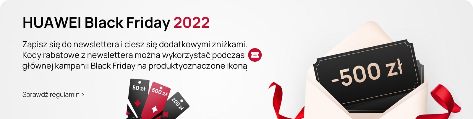 Wybrane artykuły dostępne w ofercie Huawei Black Friday w sklepie huawei.pl można nabyć także korzystając z dodatkowych kuponów rabatowych – aby je zdobyć wystarczy zapisać się na stronie do newslettera i w pierwszym mailu otrzymamy komplet dostępnych kodów zniżkowych o wartości 50 zł (przy zakupach za minimum 299 zł), 200 zł (przy zakupach za minimum 1000 zł) oraz aż 500 zł (przy zakupach za minimum 3000 zł). Kupony można wykorzystać przy zakupie produktów oznaczonych specjalną ikoną.
