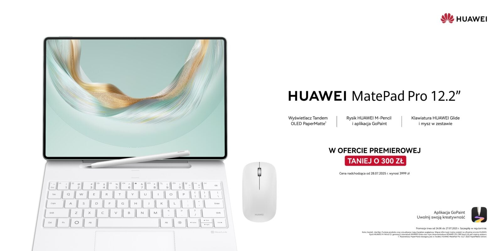 Rekomendowana cena detaliczna tego modelu wynosi 3999 zł, ale w ramach specjalnej oferty premierowej, trwającej od 24 czerwca do 27 lipca 2025 r., cena zostanie obniżona o 300 zł, do 3699 zł. W tej cenie dostajemy nie tylko tablet, ale też kompletny zestaw akcesoriów Huawei: klawiaturę HUAWEI Glide, rysik HUAWEI M-Pencil 3. generacji oraz mysz bezprzewodową HUAWEI NearLink CD23-R. Dodatkowo, producent oferuje bezpłatne wydłużenie gwarancji o 12 miesięcy.