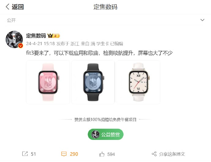 Jak wynika z najnowszego przecieku, udostępnionego na Weibo przez leakera Fixed Focus Digital, tegoroczny model może mocno odbiegać od tego, co znamy z poprzednich generacji. O ile wcześniejsze warianty kojarzyły się raczej z opaskami, o tyle Watch Fit 3 na pierwszy rzut oka może przypominać Apple Watch, a to za sprawą bardziej kwadratowego ekranu i „flagowej korony” z lewej strony, choć ten element w modelach Apple’a umieszczony jest bardziej na środku bocznej ramki. Nie znamy przekątnej ekrany i wiemy jedynie, że będzie to wyświetlacz 2,5 D.