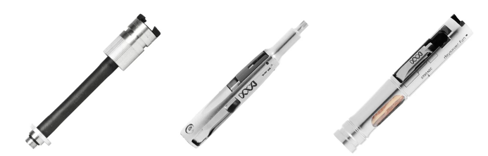 Składana pompka rowerowa, jak to składana pompka rowerowa – nie robi na nas już większego wrażenia. Jednak Incredible Pump wcale nie jest taka zwykła, bo jej pusty uchwyt stanowi idealne miejsce dla wodoszczelnej komory do przechowywania multitool’i. W wersji Regular można przechować jedno narzędzie, podczas gdy model Large pomieści dwa narzędzia lub jedno narzędzie i opcjonalny wąż. Daysaver nie pozostawia klientów na lodzie w tej kwestii, bo oferuje dwa kompatybilne multitool’e – IncredibleX Hex Driver z ośmioma bitami oraz Extension Coworking7TL, czyli hybrydowe narzędzie do napraw opon i łańcuchów. Oba multitool’e są kompaktowe i zaprojektowane specjalnie do typowych napraw rowerowych, takich jak wymiana dętek czy dokręcanie śrub.