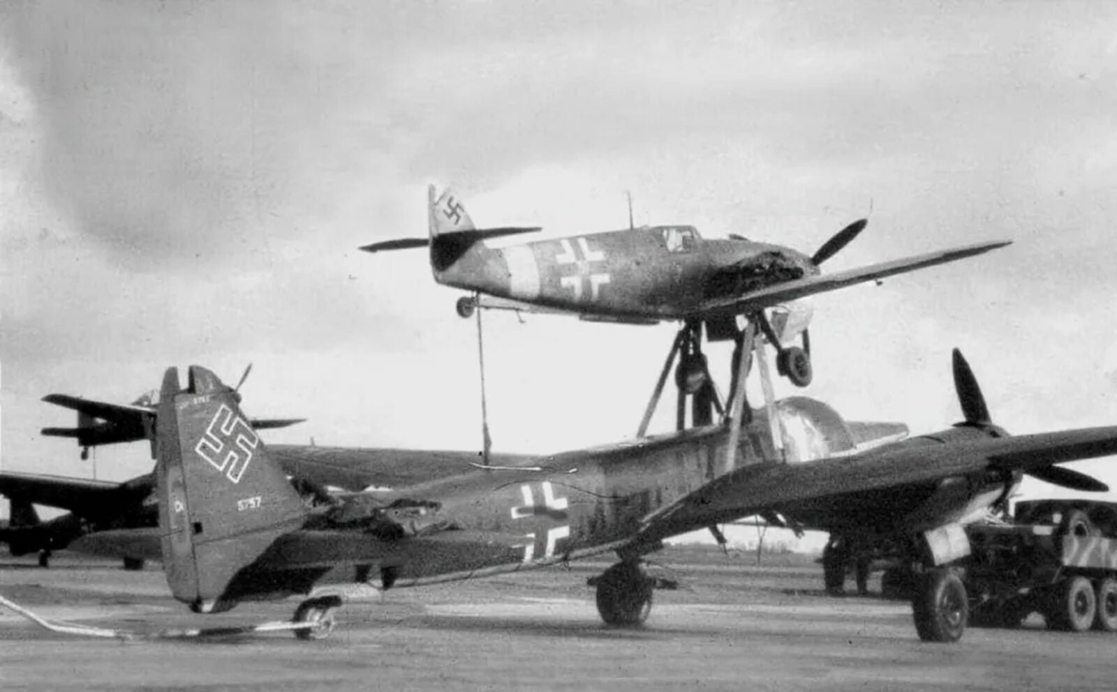 Naziści nie wpadli jednak na specjalnie rewolucyjny pomysł wystrzeliwania tych unikalnych bombowców-pocisków. Zamiast tego postanowili po prostu przyczepiać je do dolnej części dwóch szczególnych załogowych myśliwców, bo Messerschmittów Bf 109 i Focke-Wulfów Fw 190. W efekcie te samoloty wznosiły się w przestworza bez jakiegokolwiek bezpośredniego kontaktu swoich elementów z ziemią, a następnie leciały do celu z pozbawionym załogi bombowcem “pod sobą”. Po obraniu odpowiedniej trajektorii kolizyjnej zwyczajnie odłączały od siebie znacznie większe bombowce, a fizyka robiła już resztę. Można powiedzieć, że w pewnym sensie ta broń była prekursorem dzisiejszych bomb ze skrzydłami, ale w bardzo, ale to bardzo prymitywnym wydaniu.