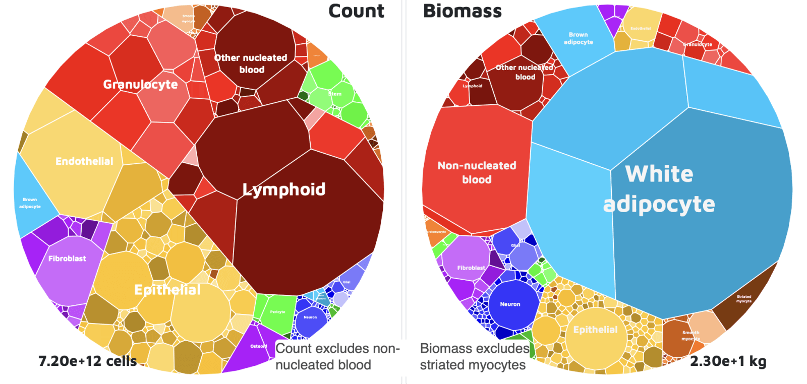 Z kompleksowej analizy ponad 1500 opublikowanych źródeł wynika, że większość dorosłych mężczyzn zawiera łącznie około 36 bilionów komórek, podczas gdy dorosłe kobiety mają zwykle około 28 bilionów komórek. Dla porównania, 10-letnie dziecko ma około 17 bilionów. Ale nie liczby są tu najważniejsze. Okazuje się, że jeżeli podzielilibyśmy komórki na kategorie na podstawie ich wielkości, każda z nich miałaby mniej więcej taki sam udział w masie ciała.