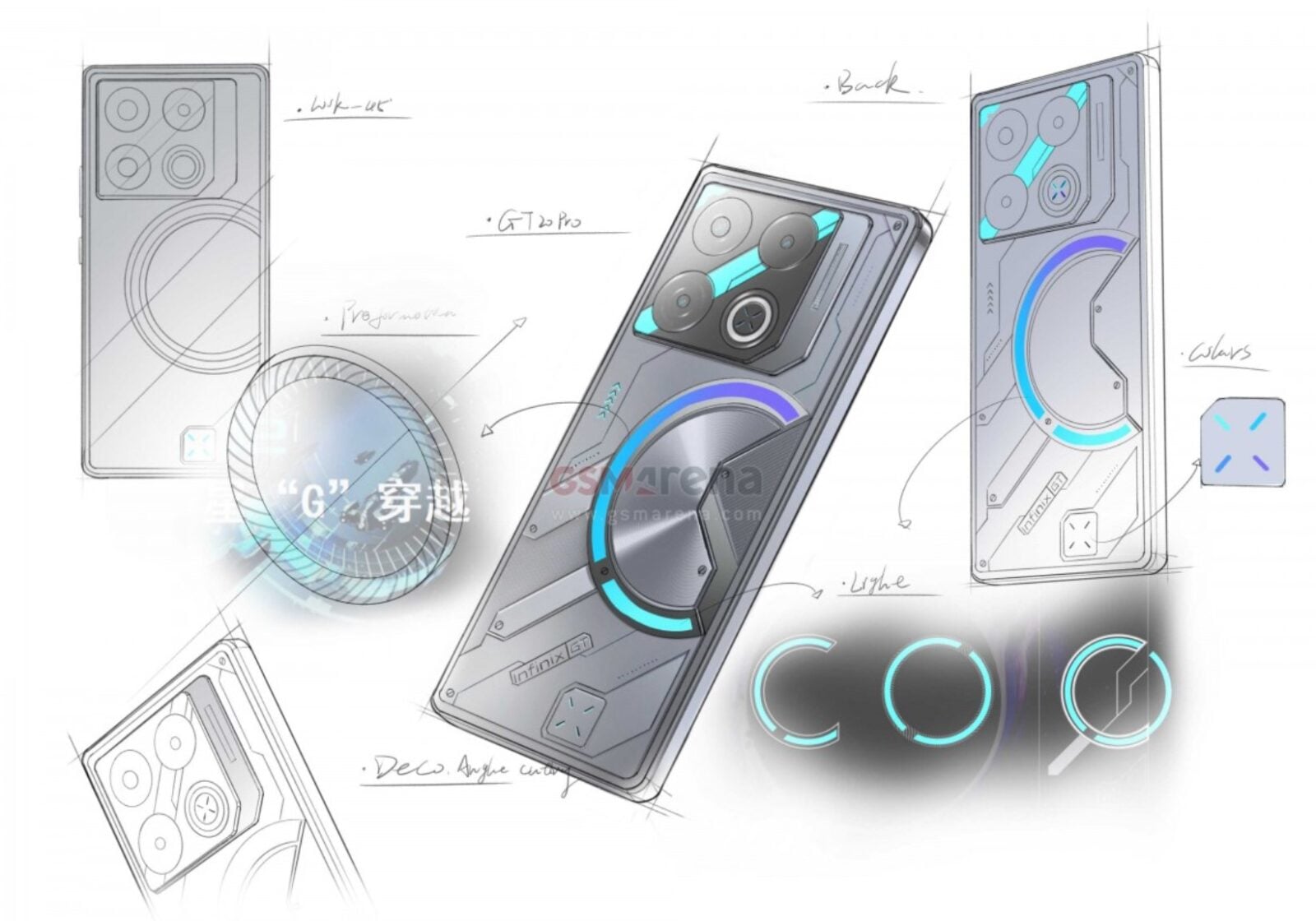 Jak możecie zauważyć na szkicach projektowych, mamy tu sporo elementów, które wprowadzono w GT 10 Pro, takie jak pięciokątna wyspa aparatów, potrójny moduł z lampą LED oraz plecki wyglądające trochę na przezroczyste. Od razu widać, że będzie to smartfon gamingowy i takie też rozwiązania znajdą się na jego pokładzie, począwszy od podwójnego chipsetu. Zgodnie z informacjami, jeden układ ma obsługiwać wyświetlacz, a przede wszystkim częstotliwość odświeżania obrazu w grach do 120 Hz. Drugi natomiast będzie odpowiedzialny za zapewnienie lepszej efektywności i wydajności.