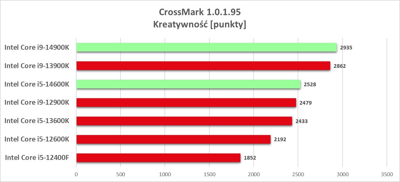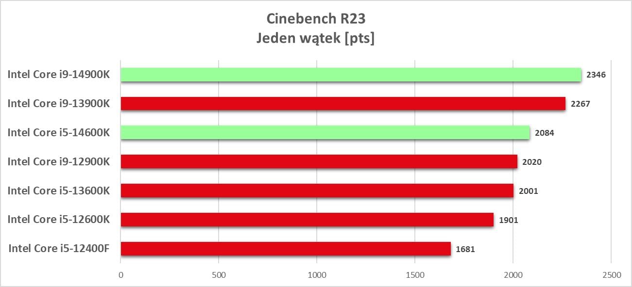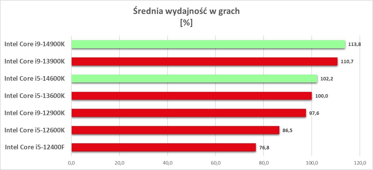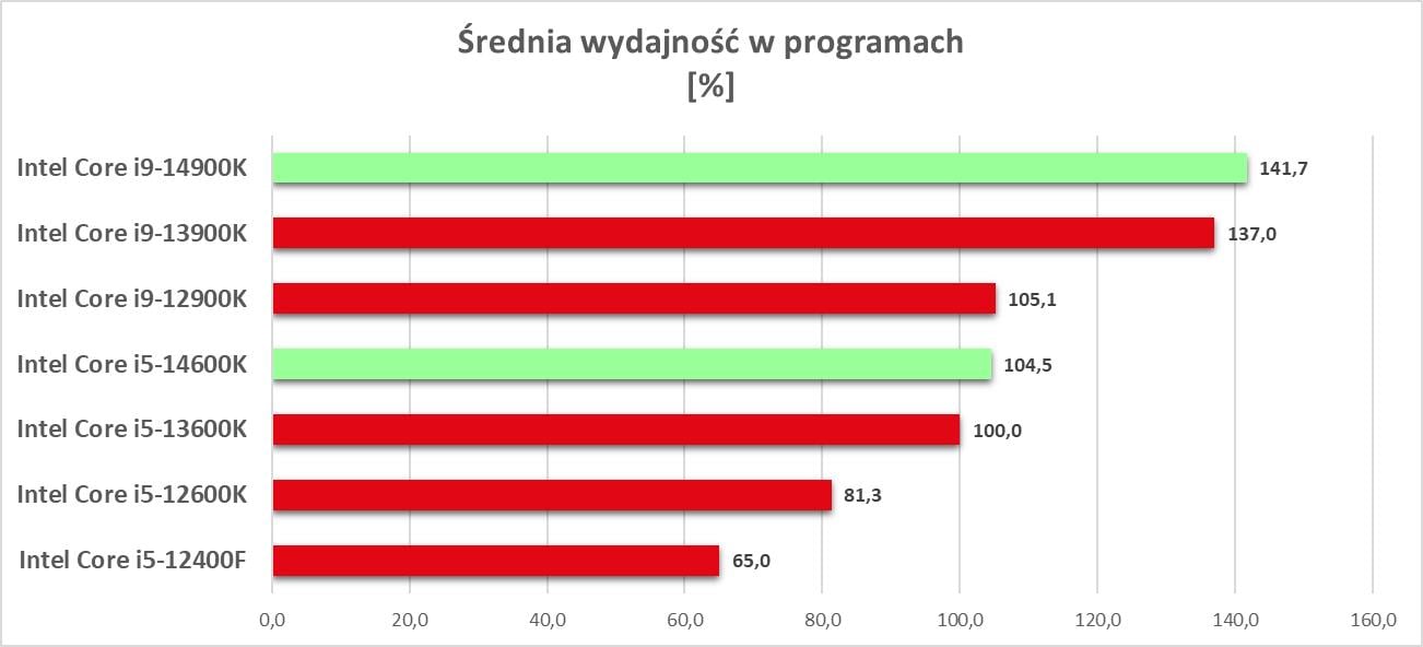 Powyższy wykres to uproszczenia i zebranie średniej wydajności ze wszystkich programów. Jak sami widzicie, różnice względem poprzedników nie są duże i dotyczy to obu konstrukcji. Nie ma więc rewolucji, ale takowej mało kto się spodziewał. Intel Core i5-14600K dogadania średnio i9-12900K, ale ma małą przewagę nad poprzednikiem. Spójrzmy choćby na wyniki w Cinebench R23, gdzie przewaga w teście jednowątkowym wynosi ok. 4,1%, a wielowątkowym ok. 3,9%. Wyższy model ma przewagę nad i9-13900K w tym samym teście równą kolejno ok. 3,5% i ok. 4,2%. Nie ma też żadnych programów, w których nowe modele znacznie wyprzedziły by poprzednika. Zgodnie z oczekiwaniami mamy więc tylko mały zysk względem modeli z poprzedniej generacji. Oczywiście tutaj jest znaczna większa różnica względem procesorów 12. generacji Intela, ale to było wiadome – wszak 13. generacja sama w sobie zrobiła spory skok wydajności.