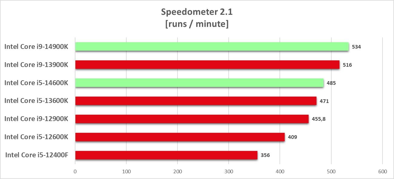 Speedometer 2.0 mierzy responsywność aplikacji internetowych. Symuluje on działania użytkownika, co pozwala na ocenienie wydajności różnych procesorów. Tutaj w testach wykorzystałem przeglądarkę Google Chrome.