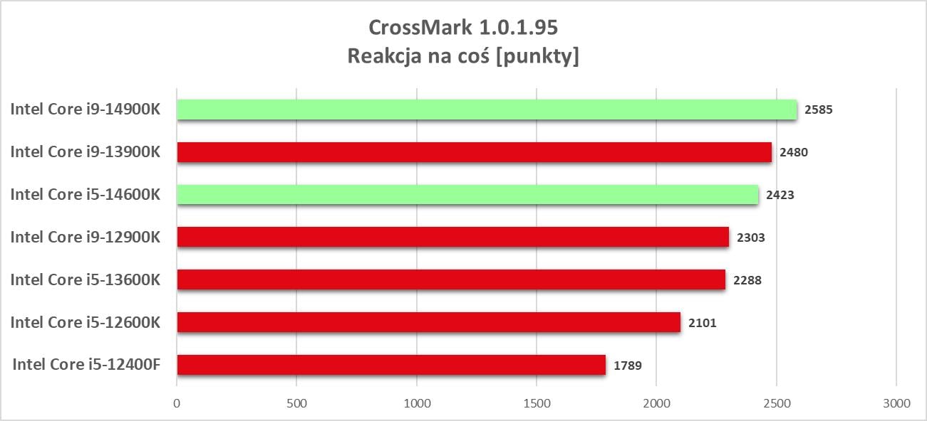 Pozostaje jeszcze kwestia cen. Intel Core i5-14600K powinien kosztować ok. 319 dolarów, co przekłada się na ok. 1360 zł, z 23% VATem wychodzi ok. 1670 zł. Poprzednika kupicie za ok. 1550 zł. W sprzedaży będzie też i5-14600KF za 294 dolary (ok. 1540 zł z VATem). W przypadku i9-14900K mowa jest o 589 dolarach, co przekłada się na ok. 2500 zł, z 23% VATem ok. 3075 zł. W sprzedaży będzie też model i9-14900KF w cenie 564 dolarów (ok. 2950 zł z VATem). Poprzednik kosztuje ok. 2940 zł (model i9-13900K). Tutaj nie ma dużych różnic cenowych i za to plus dla Intela – nie ma rewolucji w wydajności, więc ceny też pozostają na podobnym poziomie.
