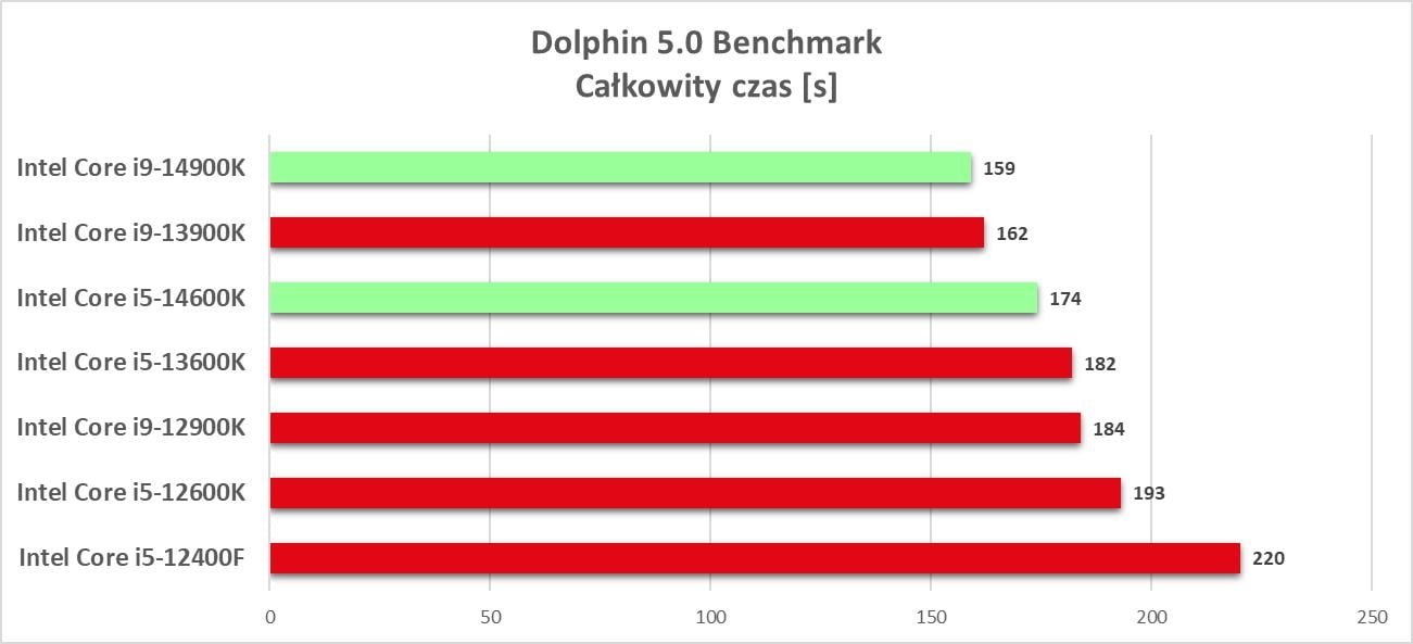 Dolphin pozwala na emulowanie konsol Nintendo Wii i GameCube. Dzięki temu można cieszyć się z gier konsolowych na pecetach, w rozdzielczości 1920 x 1080. Wykorzystałem benchmark CPU, a wynik to całkowity czas działania.