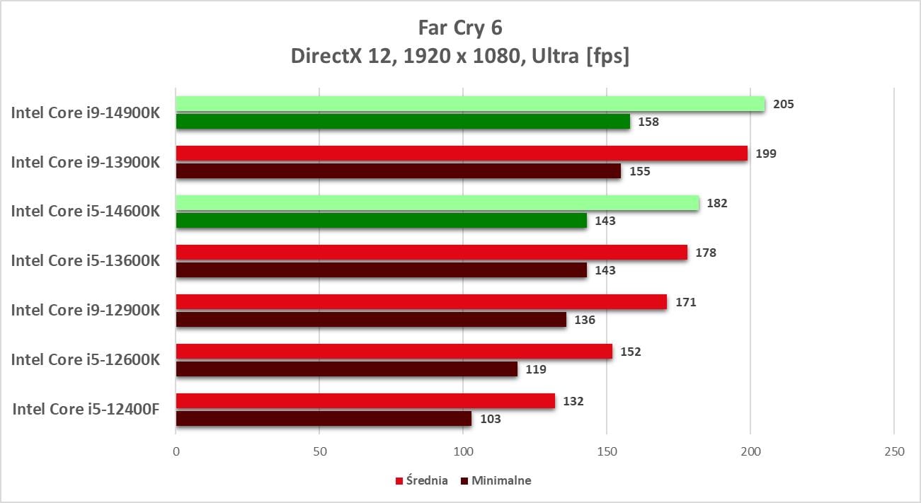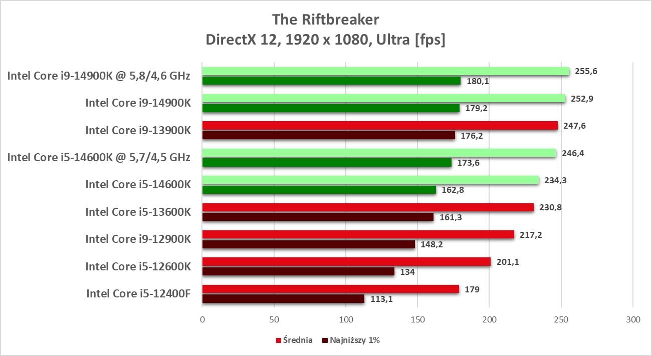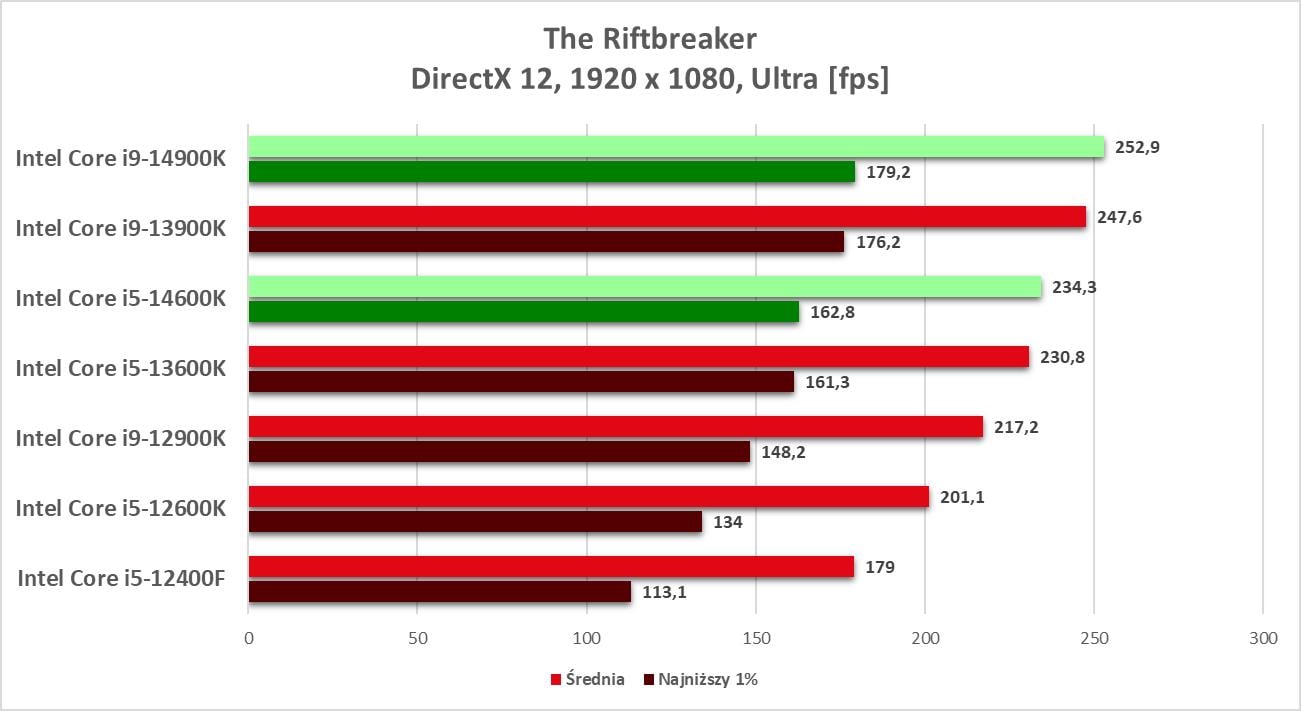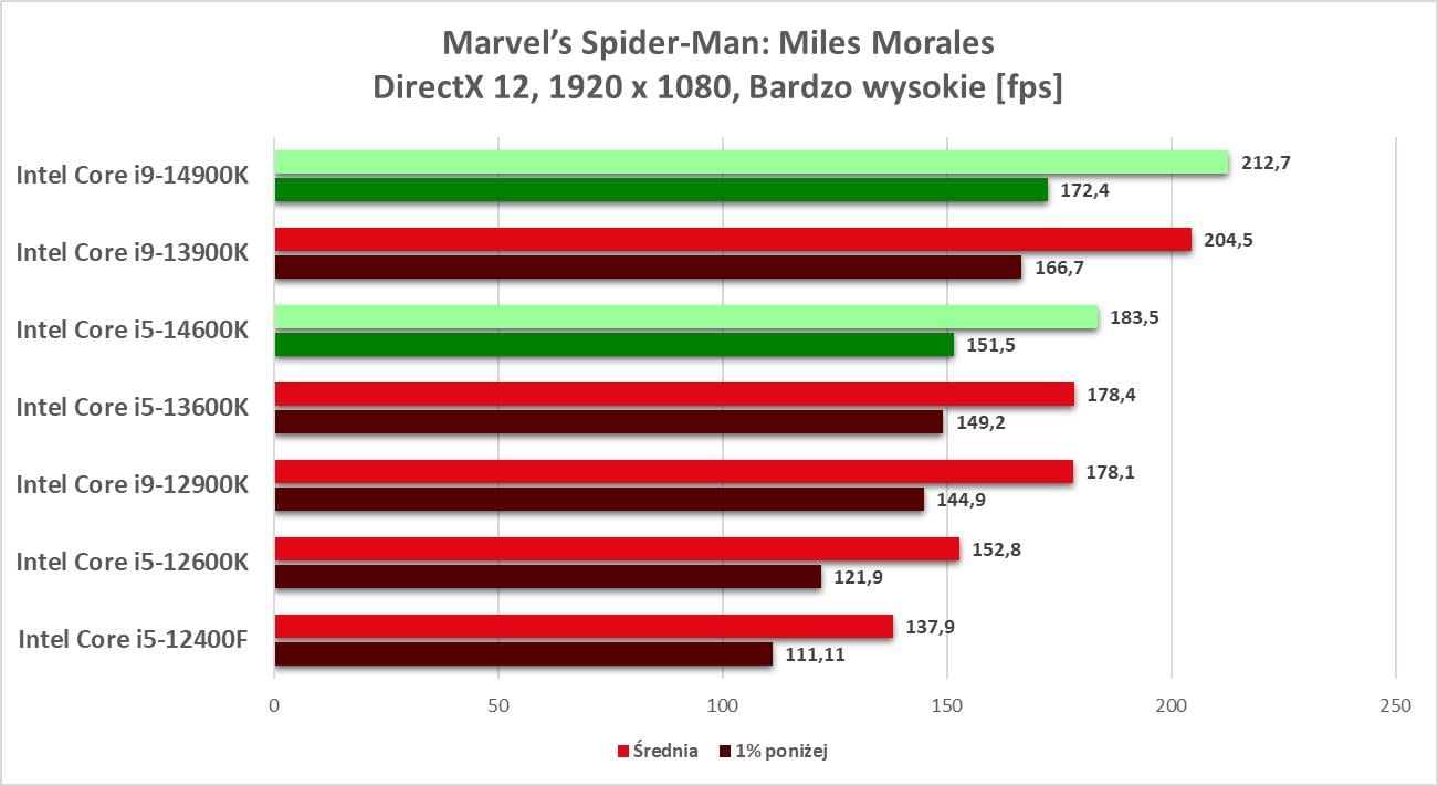 W grach również jest podobnie. Nie ma wielkich różnic względem poprzedników i zakup nowego procesora, niezależnie od której wersji, będzie skutkował tylko lekkim wzrostem wydajności. W przypadku i5-14600K nie ma żadnego tytułu, w którym wypadł znacząco lepiej. I9-14900K potrafi zwiększyć swoją przewagę do ok. 4% np. w Marvel’s Spider-Man: Miles Morales nad poprzednikiem. Nadal to nie jest jednak rewolucja ani coś, co można nazwać naprawdę sporym zyskiem.