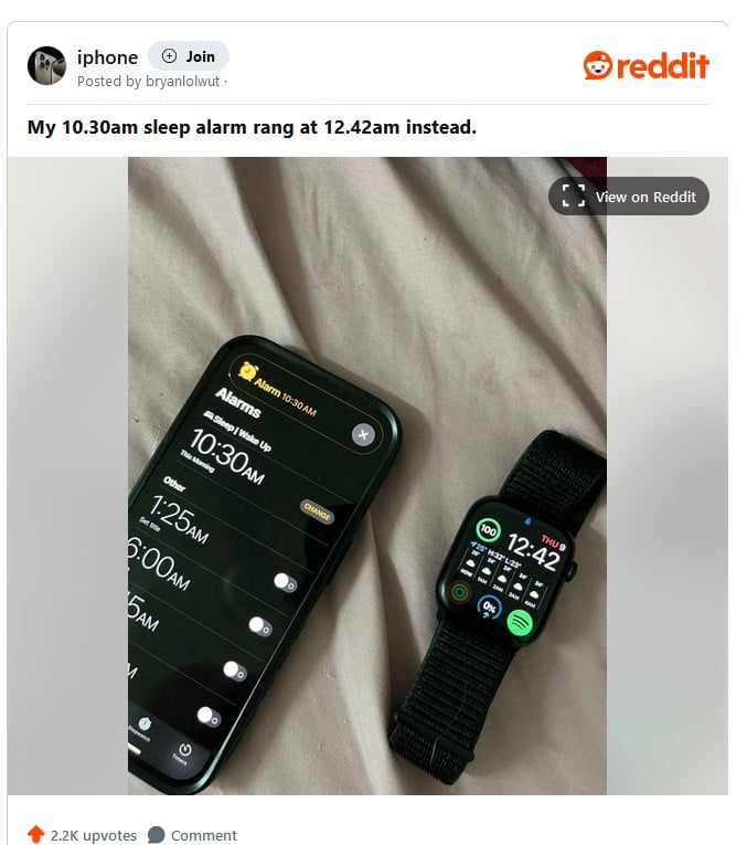 Jak pokazuje poniższy zrzut ekranu z Reddita, użytkownik miał na iPhone alarm ustawiony na 10:30, ten jednak nie włączył się o określonej porze, ale ponad dwie godziny później – o 12:42. U innego wystąpiło z kolei inne zjawisko – alarm wyświetlał się jako włączony, ale nie wydawał żadnego dźwięku i nie reagował na dotyk przez 40 minut. Bywały też przypadki, że alarm zamiast o godzinie 7:00 uruchamiał się o… 17:00!