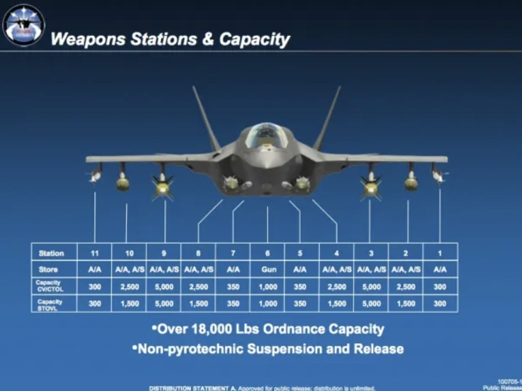 F-35 w Trybie Bestii zabiera na misje uzbrojenie zarówno w swoich wewnętrznych magazynach, jak i na zewnętrznych węzłach, co zwiększa maksymalną potencjalną wagę uzbrojenia z około 2585 kg do prawie 10000 kg. Chociaż zwiększenie ładunku bojowego wiąże się z wyższą sygnaturą radarową, co zmniejsza skuteczność technologii stealth, to jest cena warta poniesienia w specyficznych warunkach. W przypadku zmodernizowanych względem oryginału izraelskich F-35I Adir sprawa ta ma się o tyle ciekawie, że te myśliwce są w stanie przenosić na zewnętrznych punktach m.in. bomby kierowane JDAM.