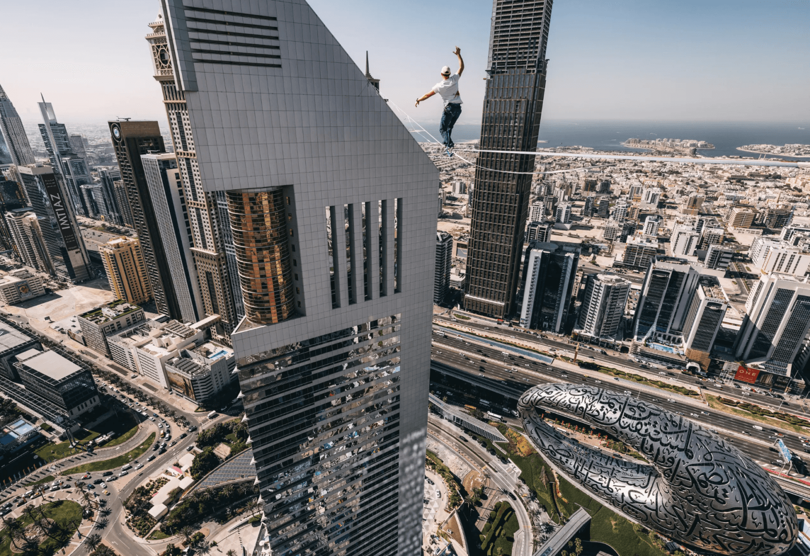 Wieże Emirates Towers, ukończone w 1999 roku, to jedne z najbardziej rozpoznawalnych budynków Dubaju. Wyższa z nich, o wysokości 355 metrów, pełni funkcję biurowca, a niższa (309 metrów) jest luksusowym hotelem. Linia, po której poruszał się Roose, została zakotwiczona na różnych wysokościach obu wież, co stworzyło dodatkowe wyzwanie – nachylenie, z którym estoński mistrz musiał się zmierzyć podczas spaceru.