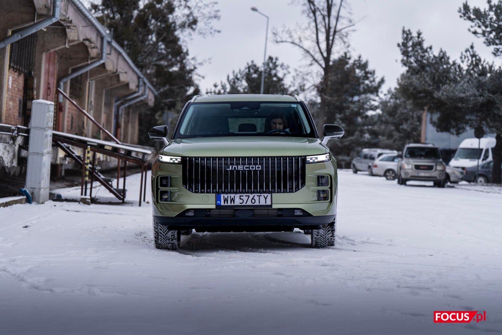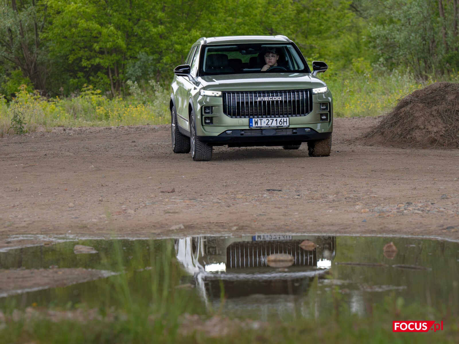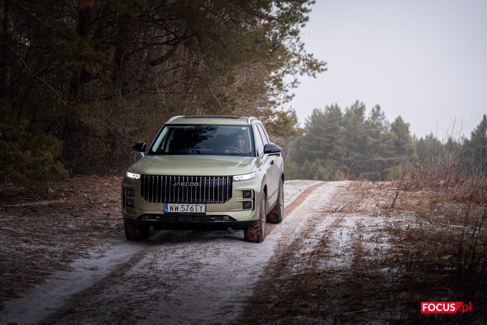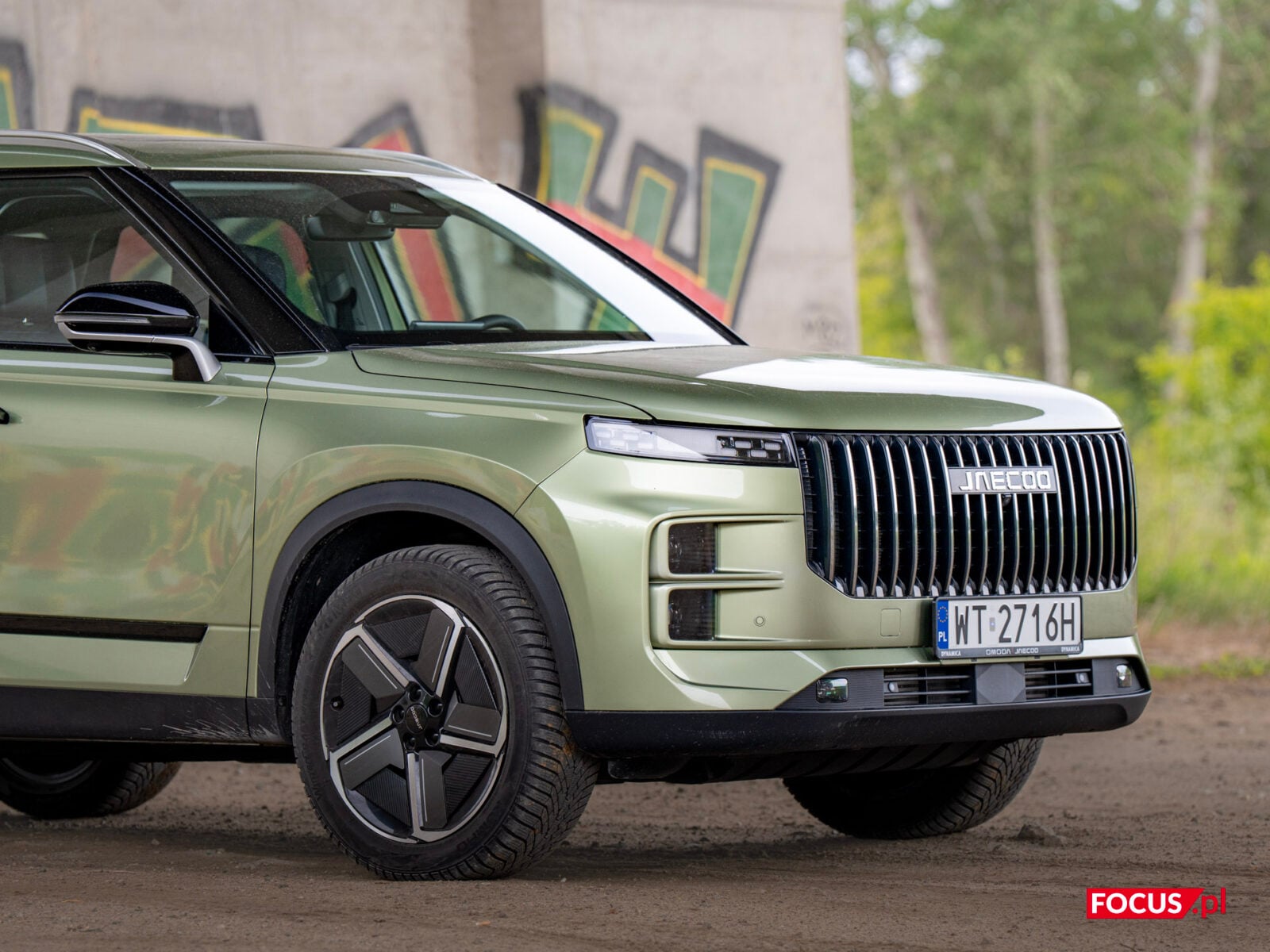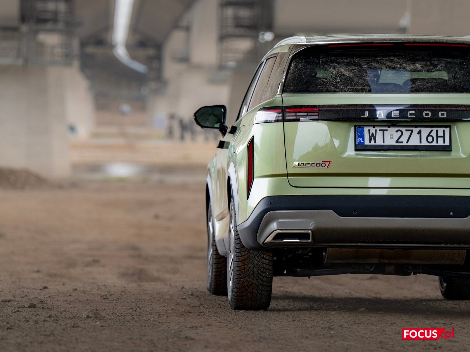 Zaskakująco spodobał mi się również zielony kolor tego samochodu, bo jeśli o to chodzi, to najbardziej lubię czarne auta, a poza tym wpadają mi w oko matowe lakiery (zazwyczaj także czarne) czy naturalny kolor stali nierdzewnej, jak w Cybertrucku Tesli. Zielone auto zazwyczaj odrzuciłbym od razu, ale ten nieco jaśniejszy militarny odcień zielonego w Jaecoo wygląda zaskakująco dobrze i świetnie się komponuje z sylwetką samochodu.