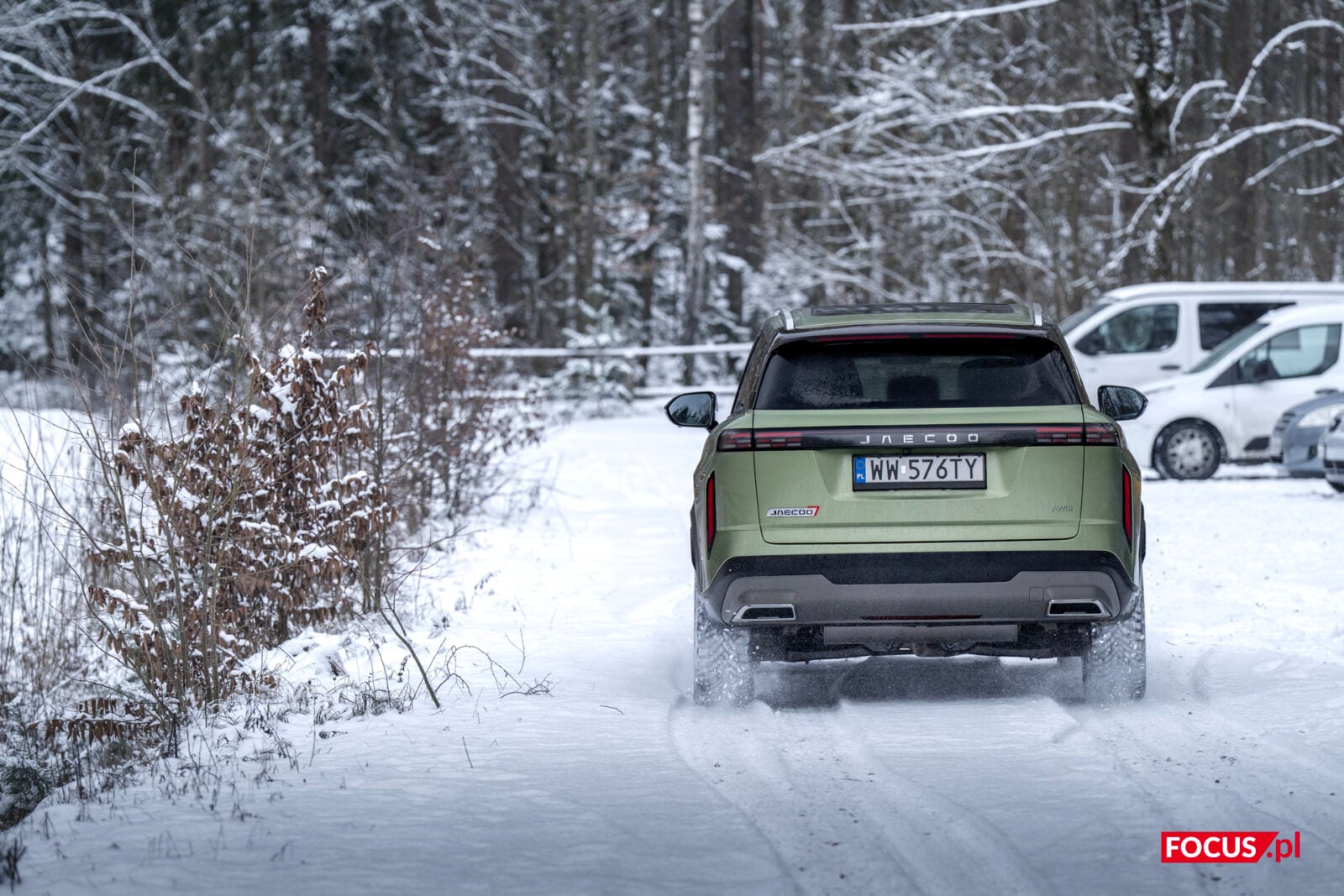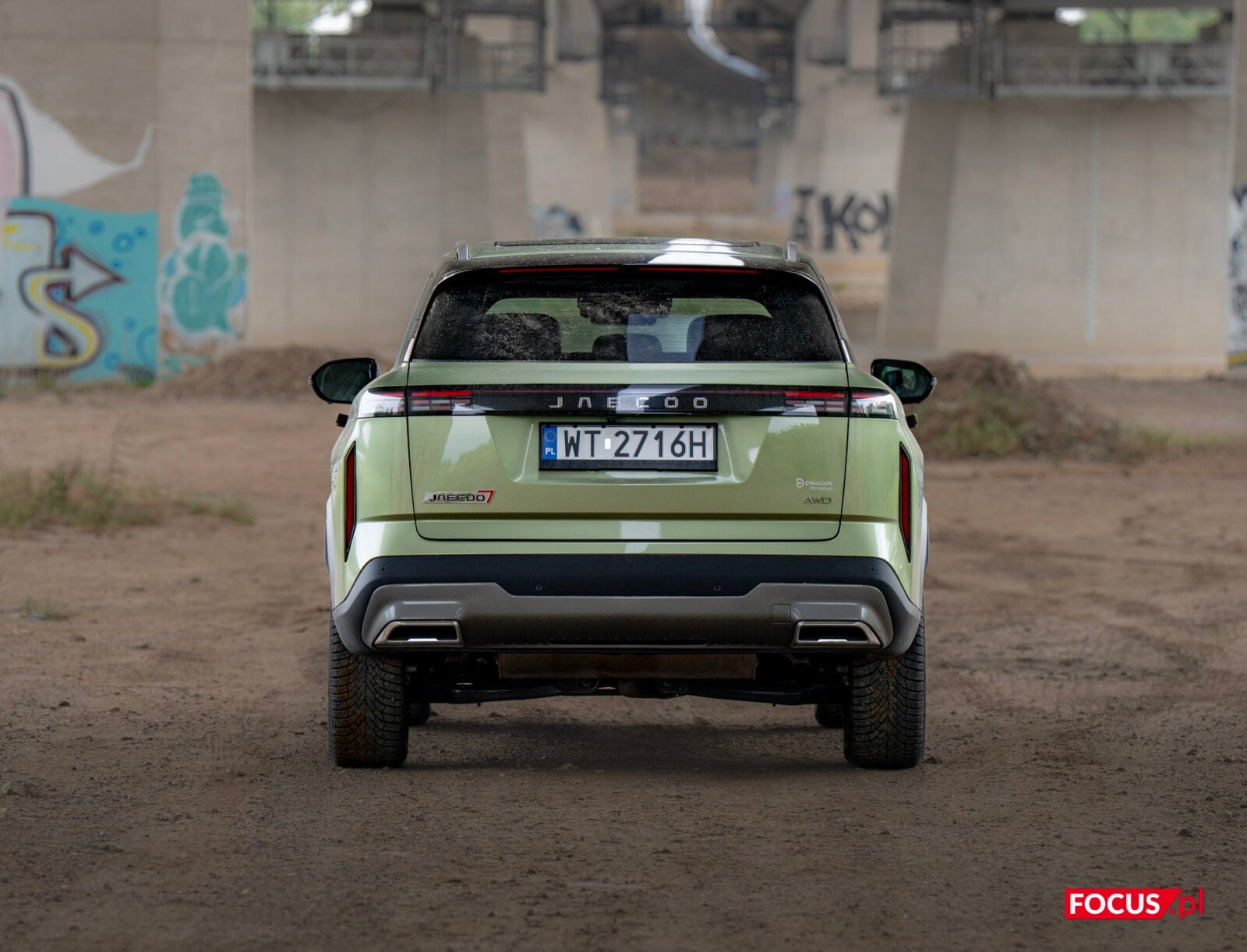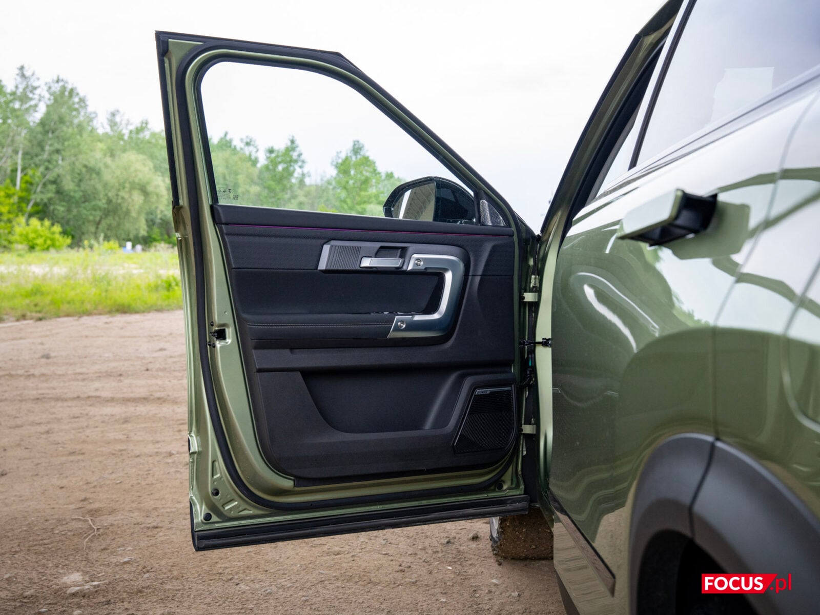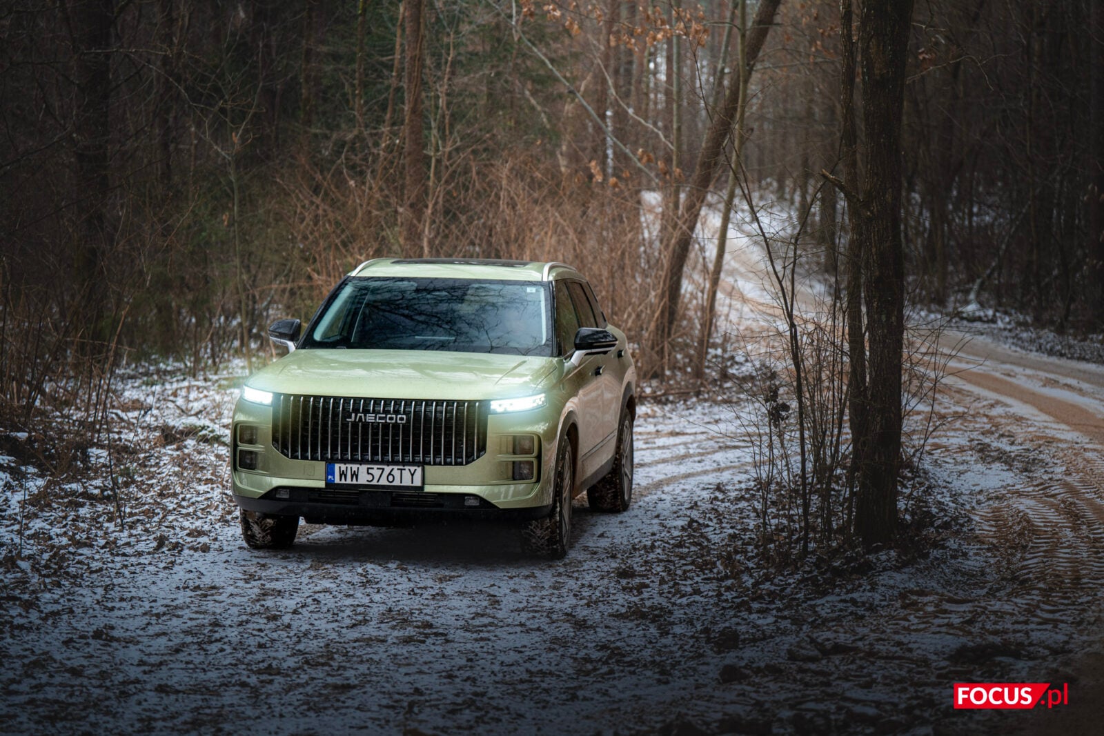 Zaskakująco spodobał mi się również zielony kolor tego samochodu, bo jeśli o to chodzi, to najbardziej lubię czarne auta, a poza tym wpadają mi w oko matowe lakiery (zazwyczaj także czarne) czy naturalny kolor stali nierdzewnej, jak w Cybertrucku Tesli. Zielone auto zazwyczaj odrzuciłbym od razu, ale ten nieco jaśniejszy militarny odcień zielonego w Jaecoo wygląda zaskakująco dobrze i świetnie się komponuje z sylwetką samochodu.