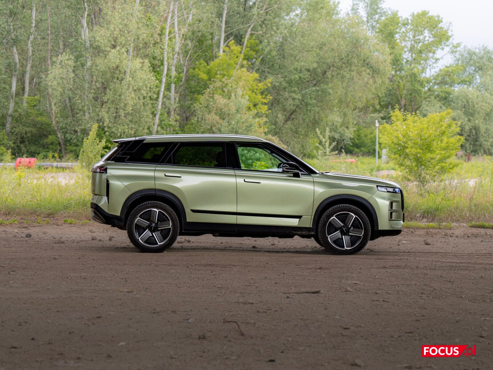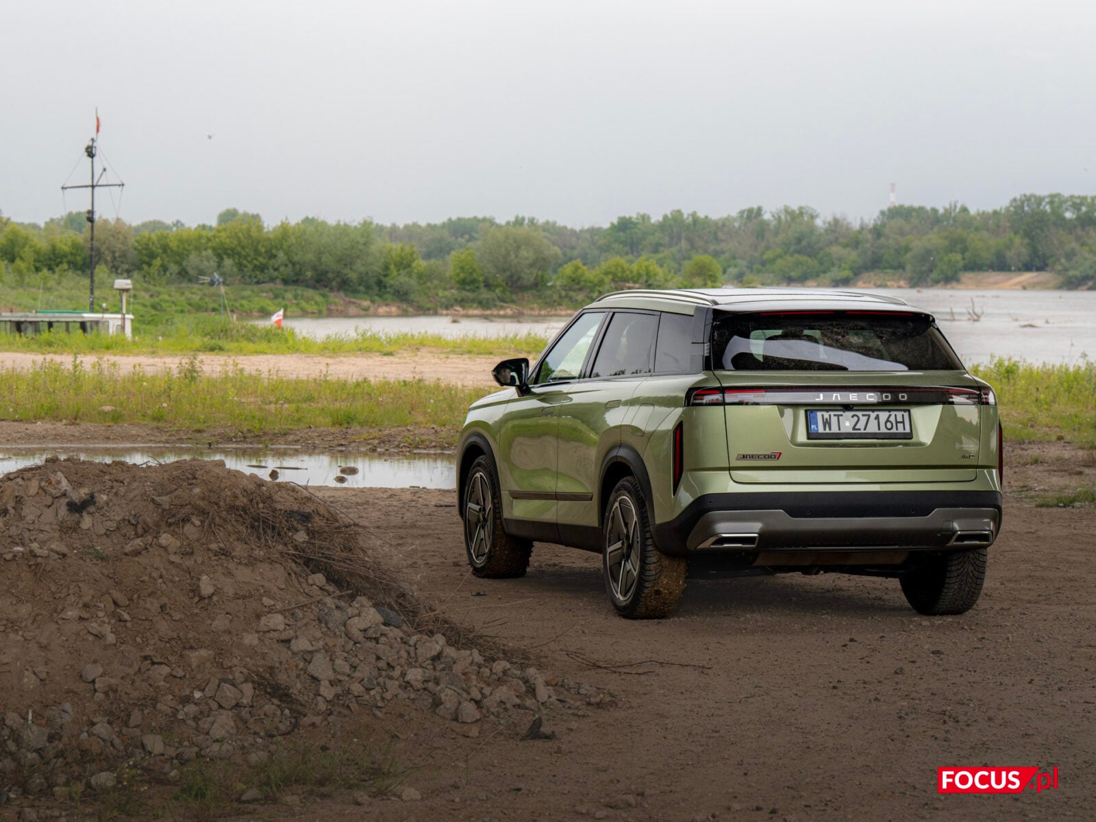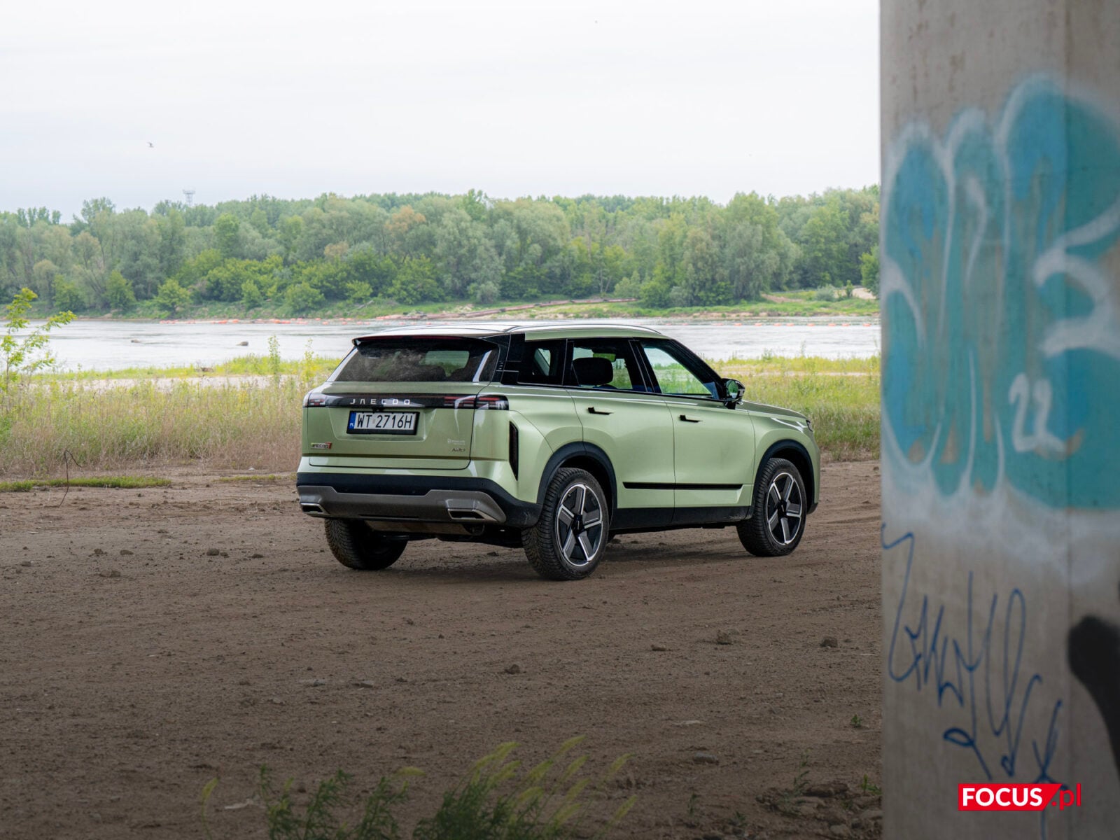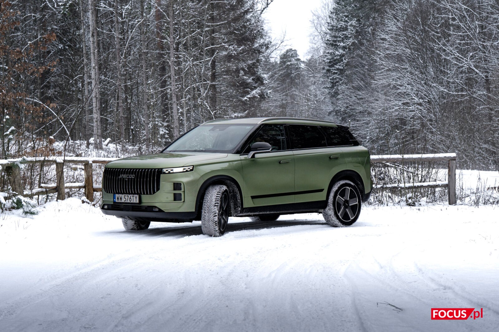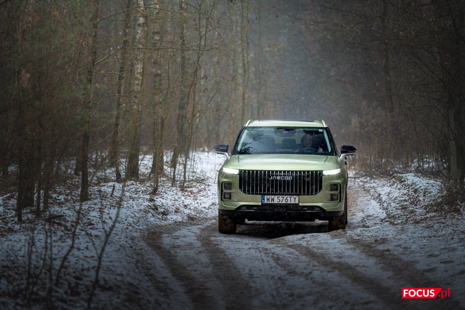 Zaskakująco spodobał mi się również zielony kolor tego samochodu, bo jeśli o to chodzi, to najbardziej lubię czarne auta, a poza tym wpadają mi w oko matowe lakiery (zazwyczaj także czarne) czy naturalny kolor stali nierdzewnej, jak w Cybertrucku Tesli. Zielone auto zazwyczaj odrzuciłbym od razu, ale ten nieco jaśniejszy militarny odcień zielonego w Jaecoo wygląda zaskakująco dobrze i świetnie się komponuje z sylwetką samochodu.