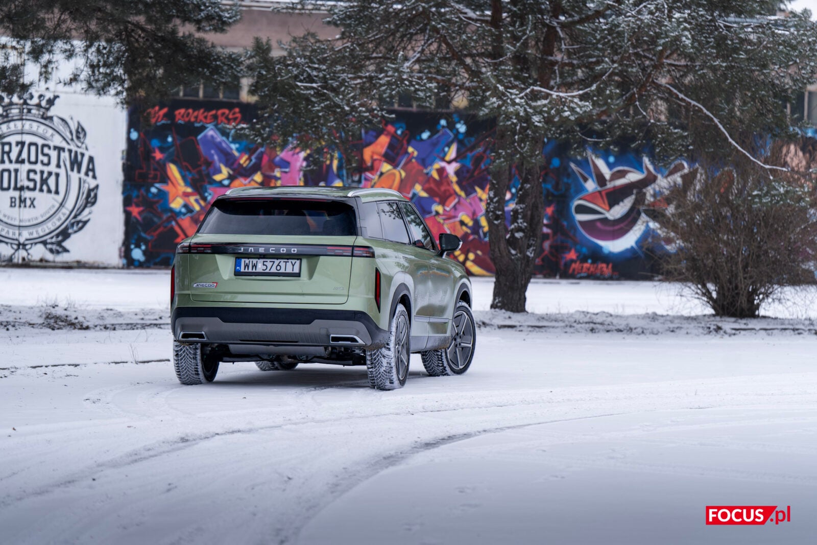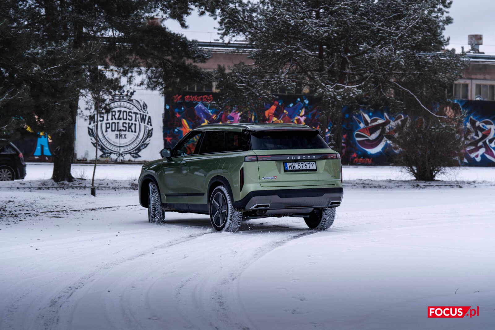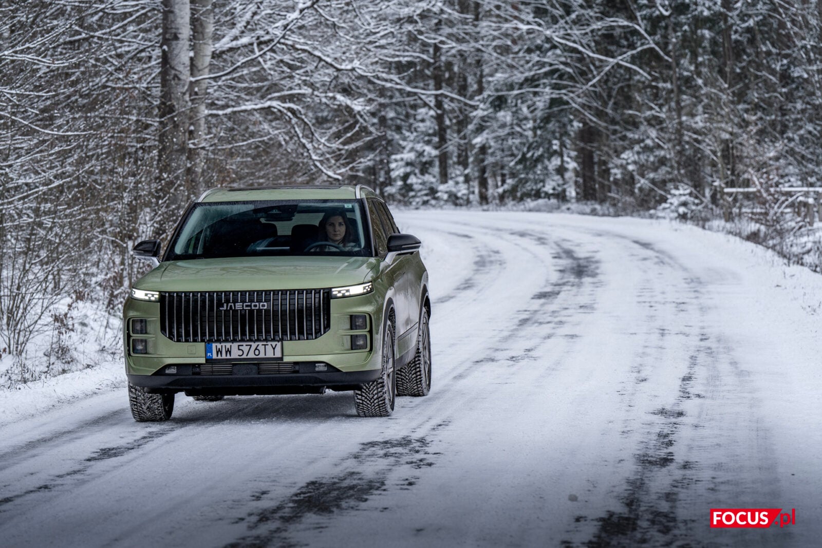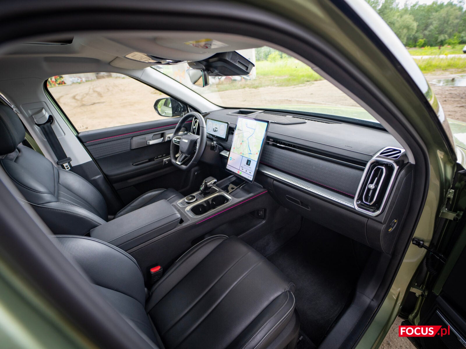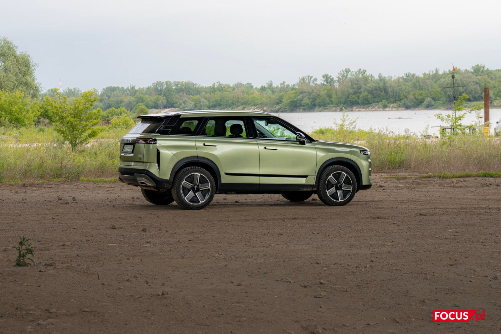 Zaskakująco spodobał mi się również zielony kolor tego samochodu, bo jeśli o to chodzi, to najbardziej lubię czarne auta, a poza tym wpadają mi w oko matowe lakiery (zazwyczaj także czarne) czy naturalny kolor stali nierdzewnej, jak w Cybertrucku Tesli. Zielone auto zazwyczaj odrzuciłbym od razu, ale ten nieco jaśniejszy militarny odcień zielonego w Jaecoo wygląda zaskakująco dobrze i świetnie się komponuje z sylwetką samochodu.