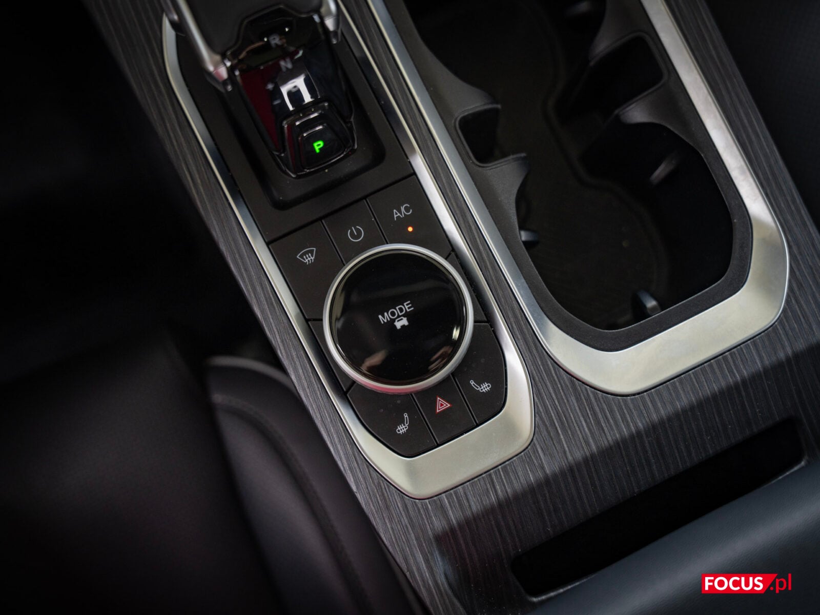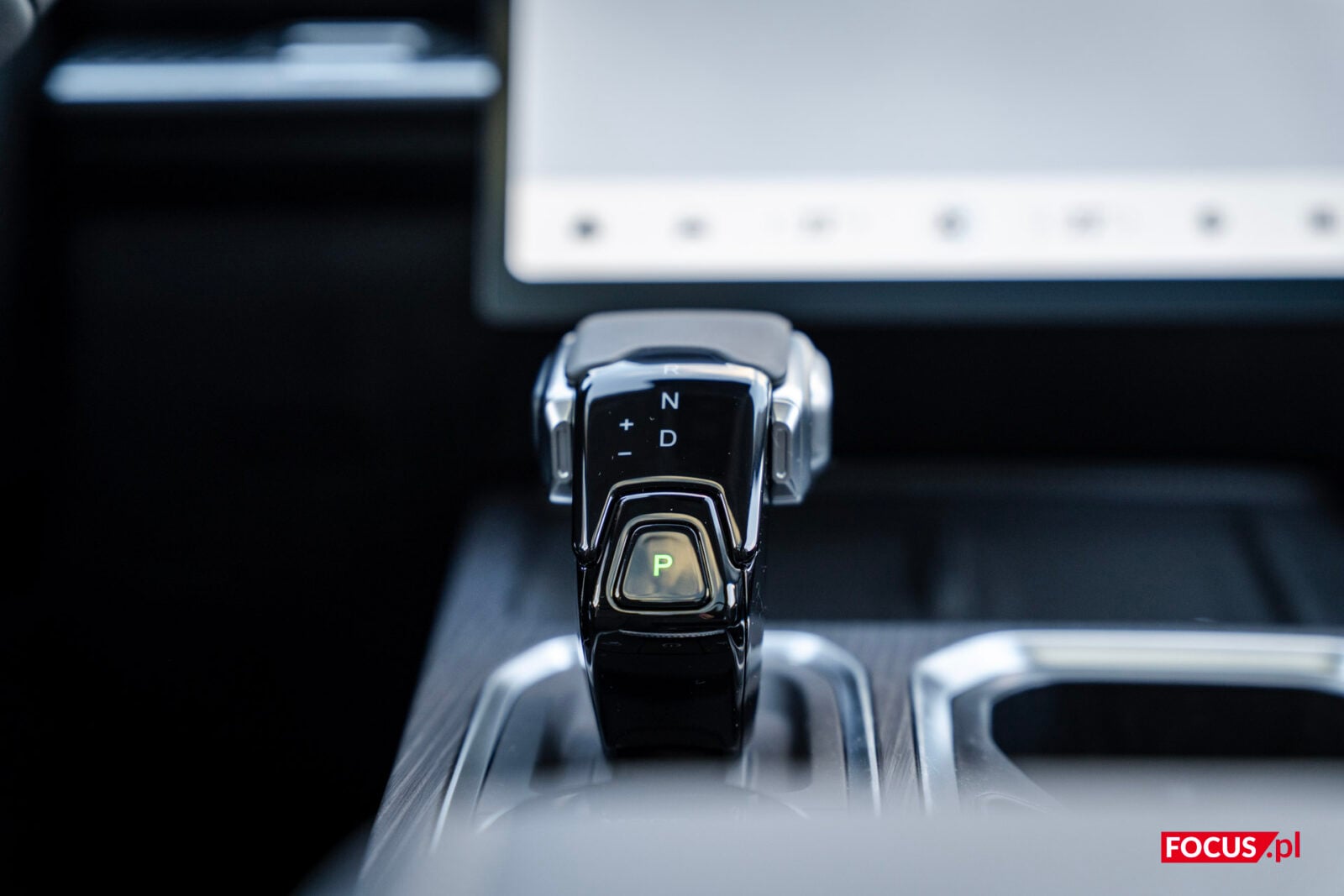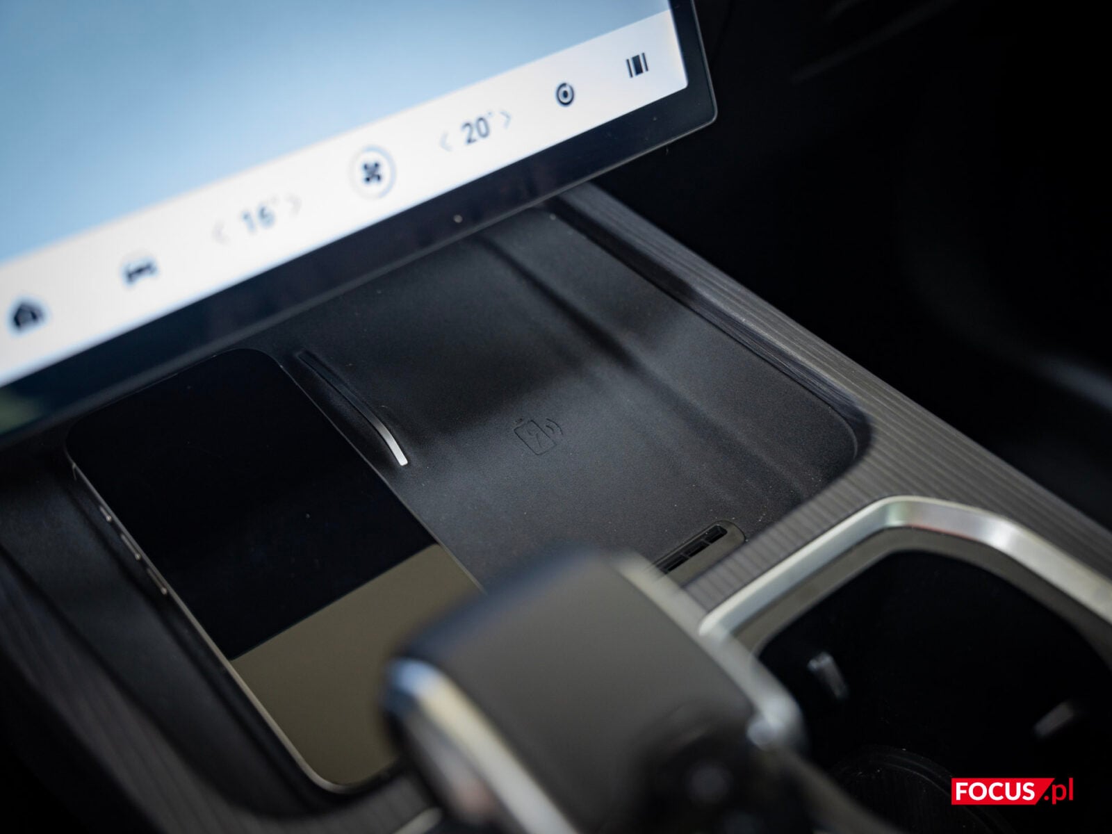 Głównym bohaterem na desce rozdzielczej jest potężny ekran, ale do tego wrócimy za chwilę. Pod ekranem mamy ładowarkę bezprzewodową, o mocy 50 W, dodatkowo chłodzoną — więc faktycznie da się z niej korzystać i realnie ładuje telefon, a nie tylko go nagrzewa. Jeśli wolicie jednak łączyć się po kablu, to do dyspozycji z przodu są porty USB-A i USB-C oraz gniazdo zapalniczki. Poniżej mamy wajchę do zmiany biegów, pokrętło do wybierania trybów jazdy i dwa cup holdery, a jeszcze dalej jest spory schowek. Standardowo też pod tunelem mamy dodatkową przestrzeń na jakieś przedmioty osobiste.