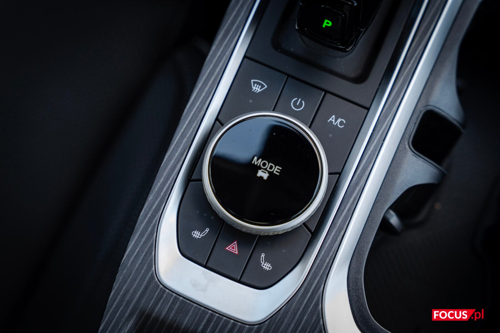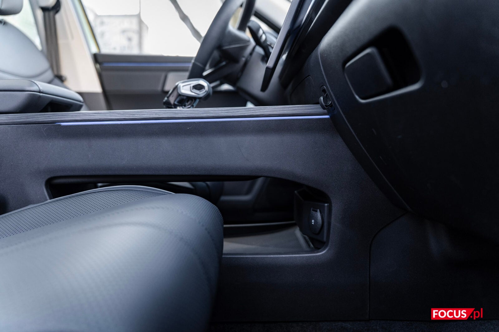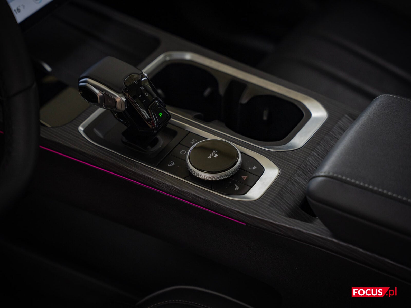 Głównym bohaterem na desce rozdzielczej jest potężny ekran, ale do tego wrócimy za chwilę. Pod ekranem mamy ładowarkę bezprzewodową, o mocy 50 W, dodatkowo chłodzoną — więc faktycznie da się z niej korzystać i realnie ładuje telefon, a nie tylko go nagrzewa. Jeśli wolicie jednak łączyć się po kablu, to do dyspozycji z przodu są porty USB-A i USB-C oraz gniazdo zapalniczki. Poniżej mamy wajchę do zmiany biegów, pokrętło do wybierania trybów jazdy i dwa cup holdery, a jeszcze dalej jest spory schowek. Standardowo też pod tunelem mamy dodatkową przestrzeń na jakieś przedmioty osobiste.