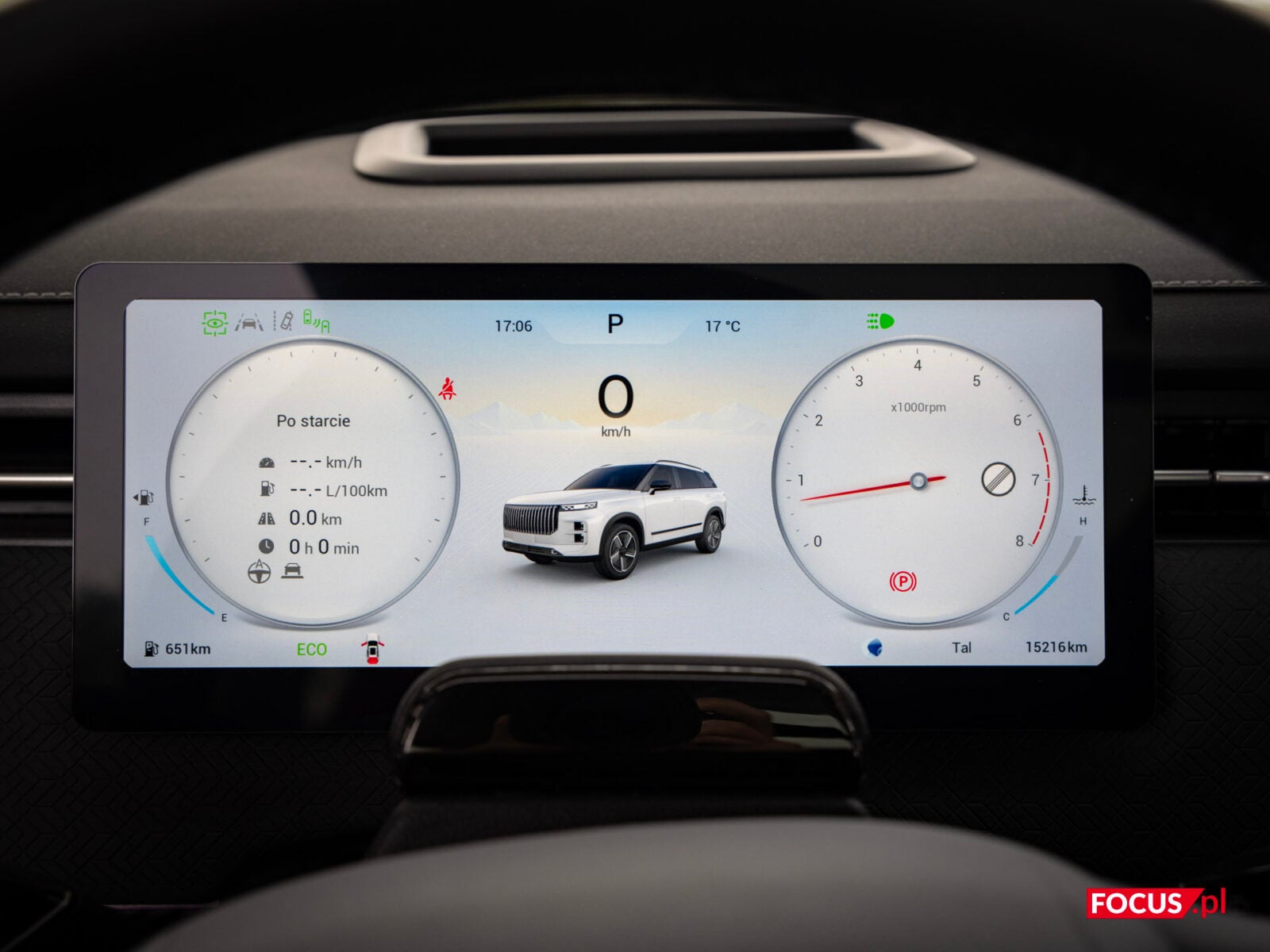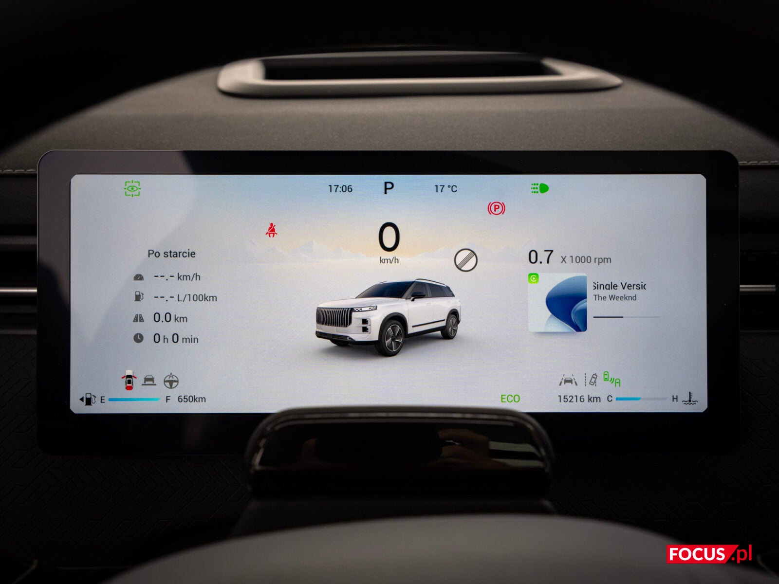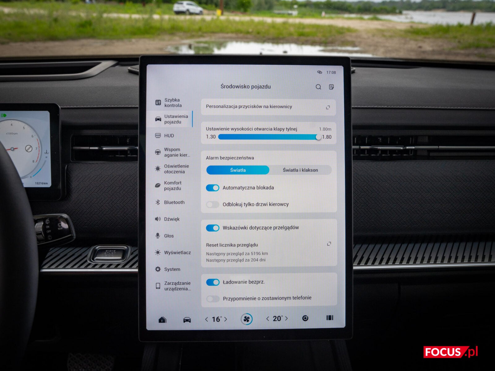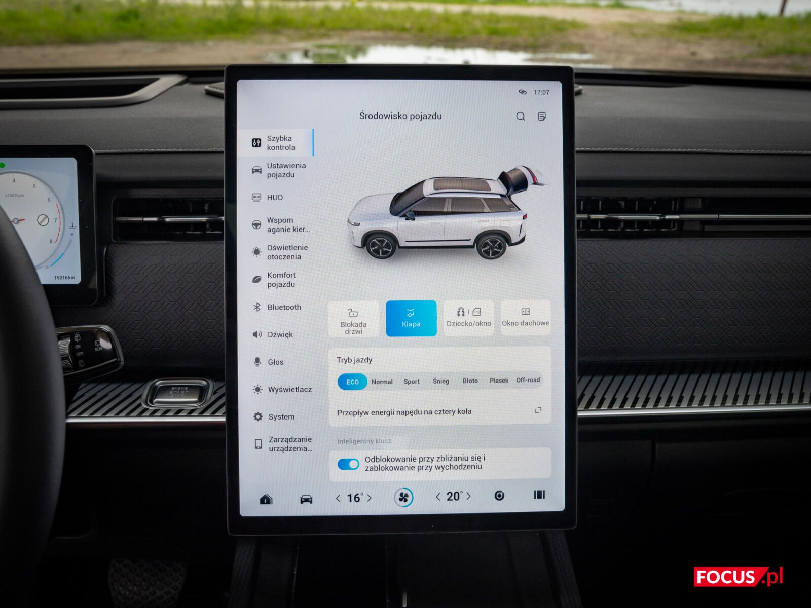 Wróćmy teraz do ekranu. Centralnym punktem kokpitu jest 14-calowy, pionowy ekran dotykowy, który wygląda i działa jak tablet z wyższej półki. Nie ma tutaj choroby tanich samochodów czy niektórych wczesnych chińczyków na naszym rynku — interfejs działa płynnie, jest intuicyjny i przejrzysty, a grafiki w wysokiej rozdzielczości cieszą oko. To naprawdę ekran najwyższej jakości — i na ten moment powiedziałbym, że ustępuje wyłącznie OLED-owi, który jest w MINI. Ustawienia są logicznie pogrupowane, a możliwość regulacji oporu kierownicy czy pedału hamulca to rzadko spotykany smaczek, który pozwala dostosować auto do własnych preferencji. Wiele europejskich marek mogłoby się od Jaecoo uczyć, jak robić system i jaki wykorzystywać ekran.