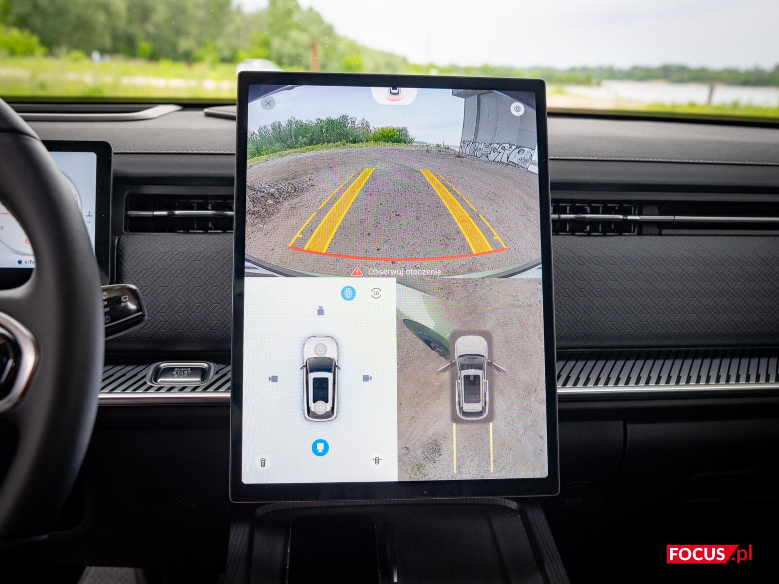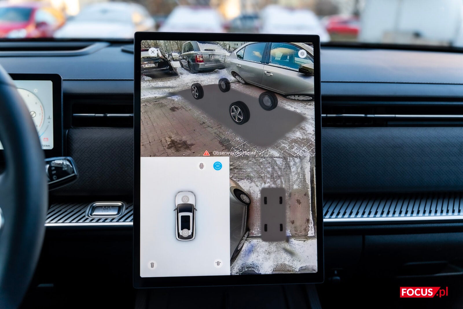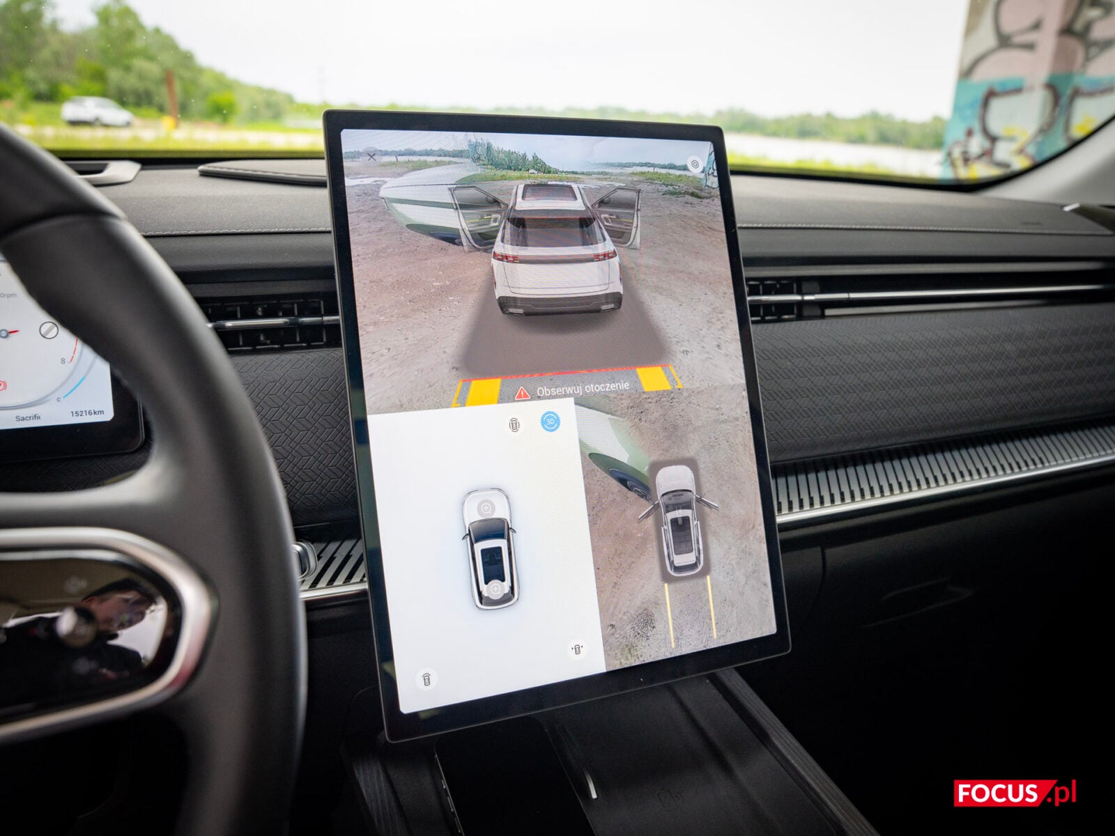 System kamer, jak to nazywa Jaecoo, 540 stopni, to faktycznie bardzo przydatna sprawa. Marka należąca do Geely oferuje nie tylko widok 360 stopni, ale też półprzezroczystą (albo całkiem przezroczystą, możemy to zmienić w ustawieniach) animację auta, która ułatwia manewrowanie w ciasnych miejscach. Jakość obrazu jest świetna, a możliwość zmiany perspektywy (góra, bok, przód, tył) to coś, co wyróżnia Jaecoo na tle konkurencji (wiem, że się powtarzam, ale szczególnie mając na uwadze propozycje innych producentów w tej cenie). Pozwala nam to zobaczyć auto z dowolnego kąta, animacje są płynne i dopracowane — naprawdę bajka.