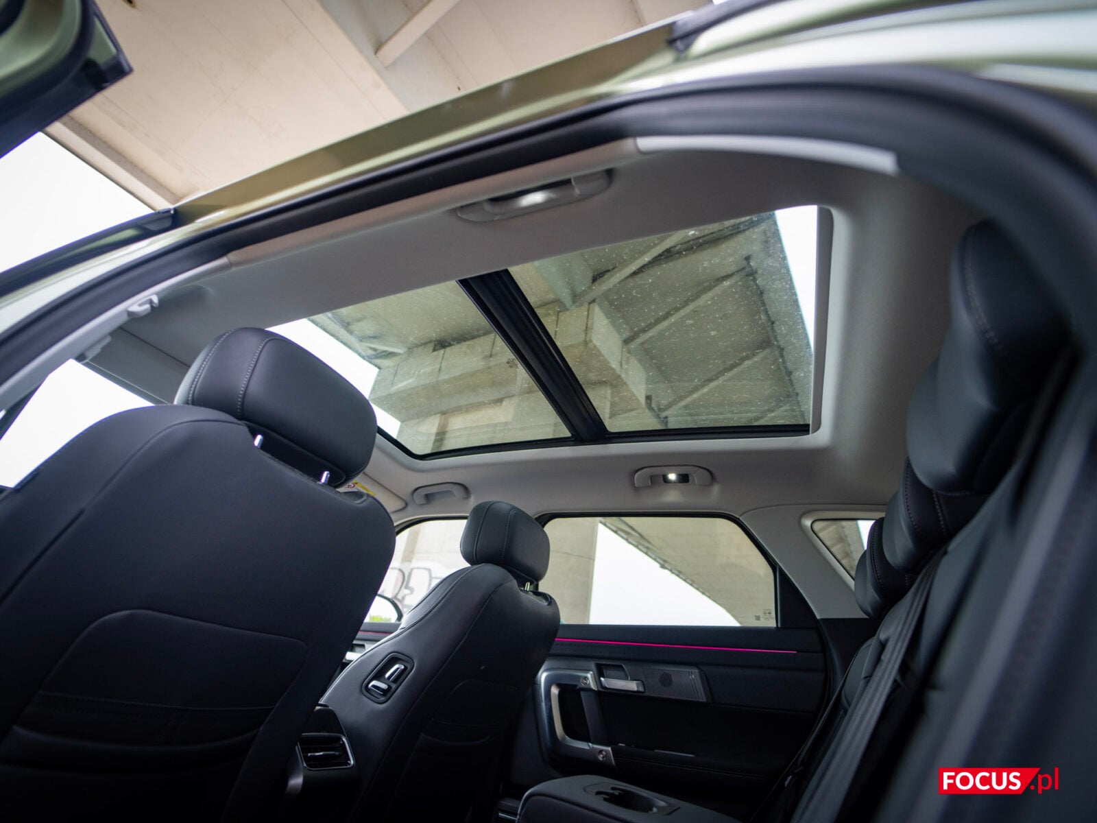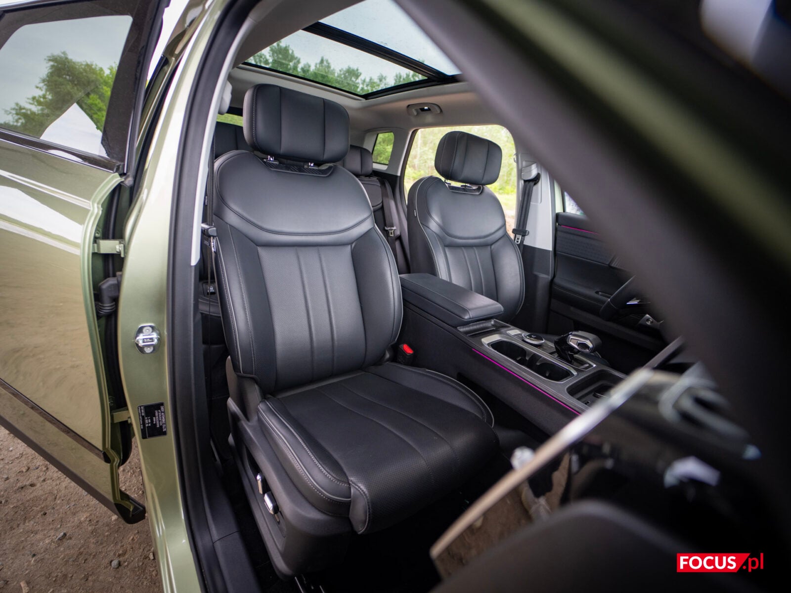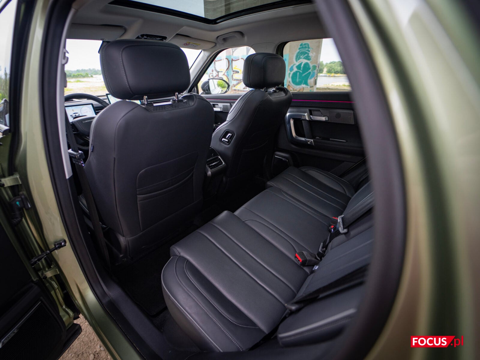 Przechodząc dalej — fotele są wygodne, dobrze wyprofilowane i w wersji Off-Road oferują podgrzewanie oraz wentylację z przodu, z tyłu zaś „samo” podgrzewanie — rzadkość w tej cenie. Nie ma tutaj masażu (który jest obecny w Beijingu 7, porównywalnym cenowo), ale trudno się czepiać o takie kwestie przy tym, ile za ten samochód musimy zapłacić. Jedyny problem z siedzeniami, jaki był dla mnie odczuwalny, to fakt, że chińskie samochody nie są do końca dostosowane do wzrostu Europejczyków. Nie jestem wcale bardzo wysoki, mam 186 cm wzrostu, a jednak po całkowitym opuszczeniu fotela, nadal siedzi się bardzo wysoko. I to, czy komuś to odpowiada czy nie, to jest kwestia czysto subiektywna — ale fakt, że przez to jest sporo gorsza widoczność (lusterko wsteczne zasłaniało mi lwią część widoku przedniej szyby, a oczy miałem naprawdę niewiele niżej od linii dachu) to coś, co nie jest idealnym rozwiązaniem. Nie jest tu tak źle jak w Omodzie 9, ale nadal jest to aspekt do poprawy. Co jednak warte odnotowania, to fakt, że obydwa fotele są regulowane elektrycznie, co — ponownie — nie jest standardem, szczególnie w tej cenie. Zdziwiło mnie jednak to, że pasażer nie ma możliwości regulacji wysokości swojego siedzenia.