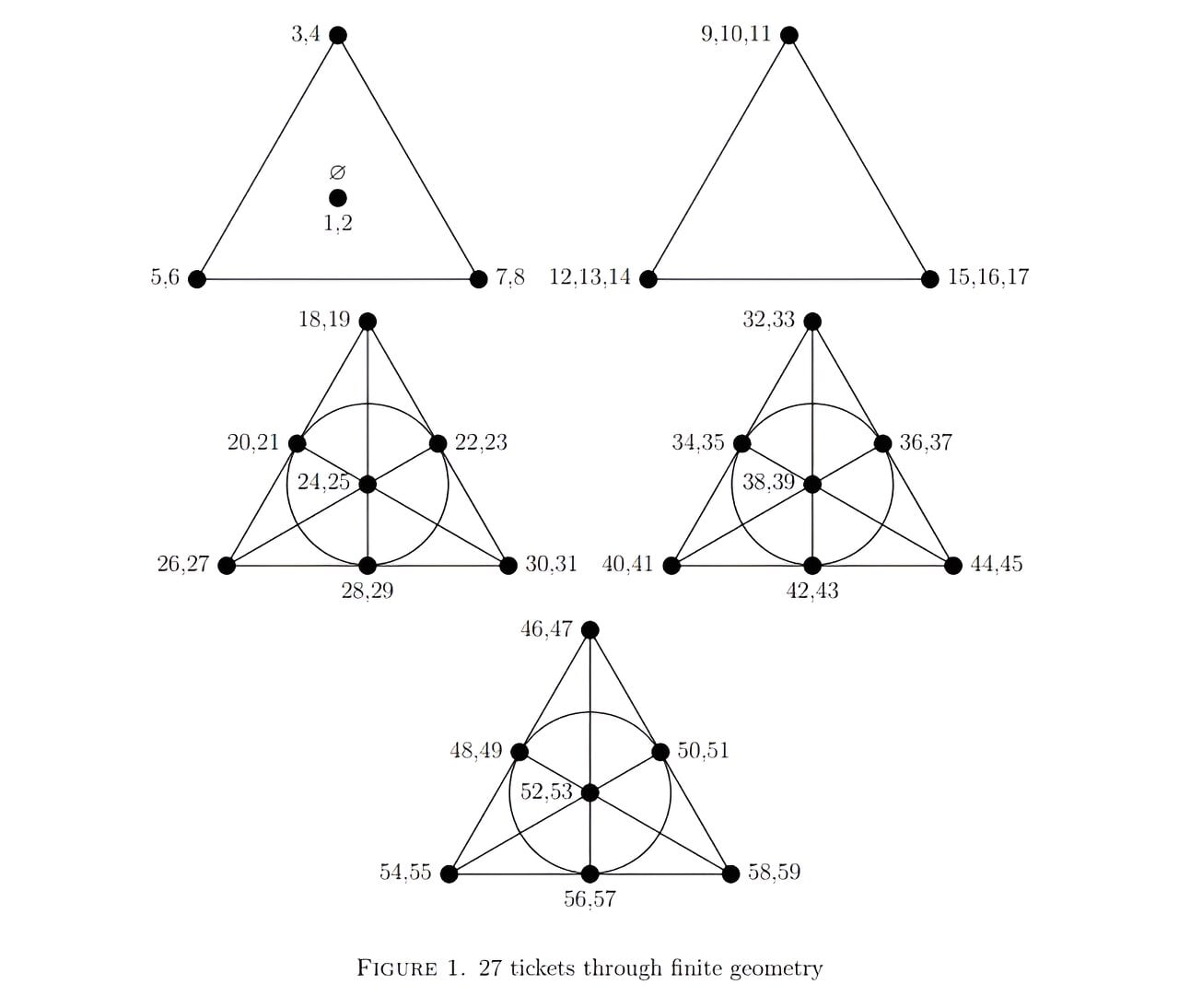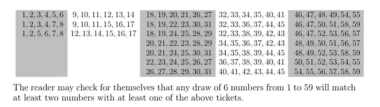 Autorzy wzięli pod uwagę tzw. płaszczyznę Fano, czyli trójkątną strukturę, w której każdy punkt jest oznaczony parami liczb i połączony liniami. Każda takowa generuje zestaw sześciu liczb, co stanowi odpowiednik jednego losu. Ostatecznie, bez względu na to, który z 45 057 474 możliwych wariantów losowania okaże się prawdziwy, co najmniej jeden kupon będzie zawierał upragniony zestaw liczb.