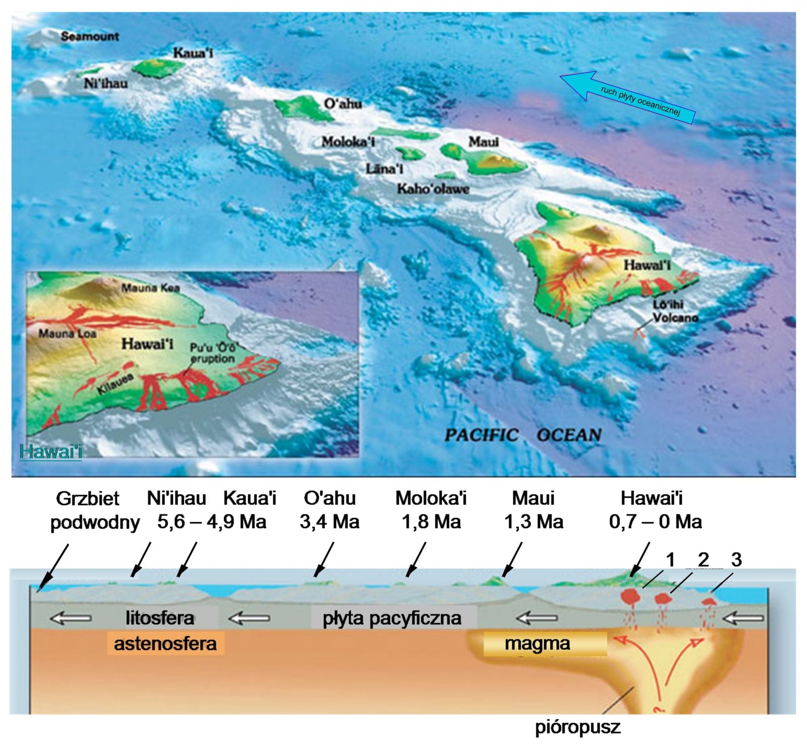Mauna Kea natomiast znajduje się na poruszającej się płycie oceanicznej. Pacyfik ciągle się rozszerza. Wobec czego i przesuwa się dno Oceanu Spokojnego. Plama gorąca pod Hawajami znajduje się ciągle w tym samym miejscu, ale płyta tektoniczna nad nią już nie. Dowodem na to jest to budowa archipelagu Hawajów – wyspy znajdują w linii prostej Grzbietu Hawajskiego. Skrawki lądu położone dalej na wschód są coraz mniejszych rozmiarów i nie wykazują już takiej dużej aktywności wulkanicznej.