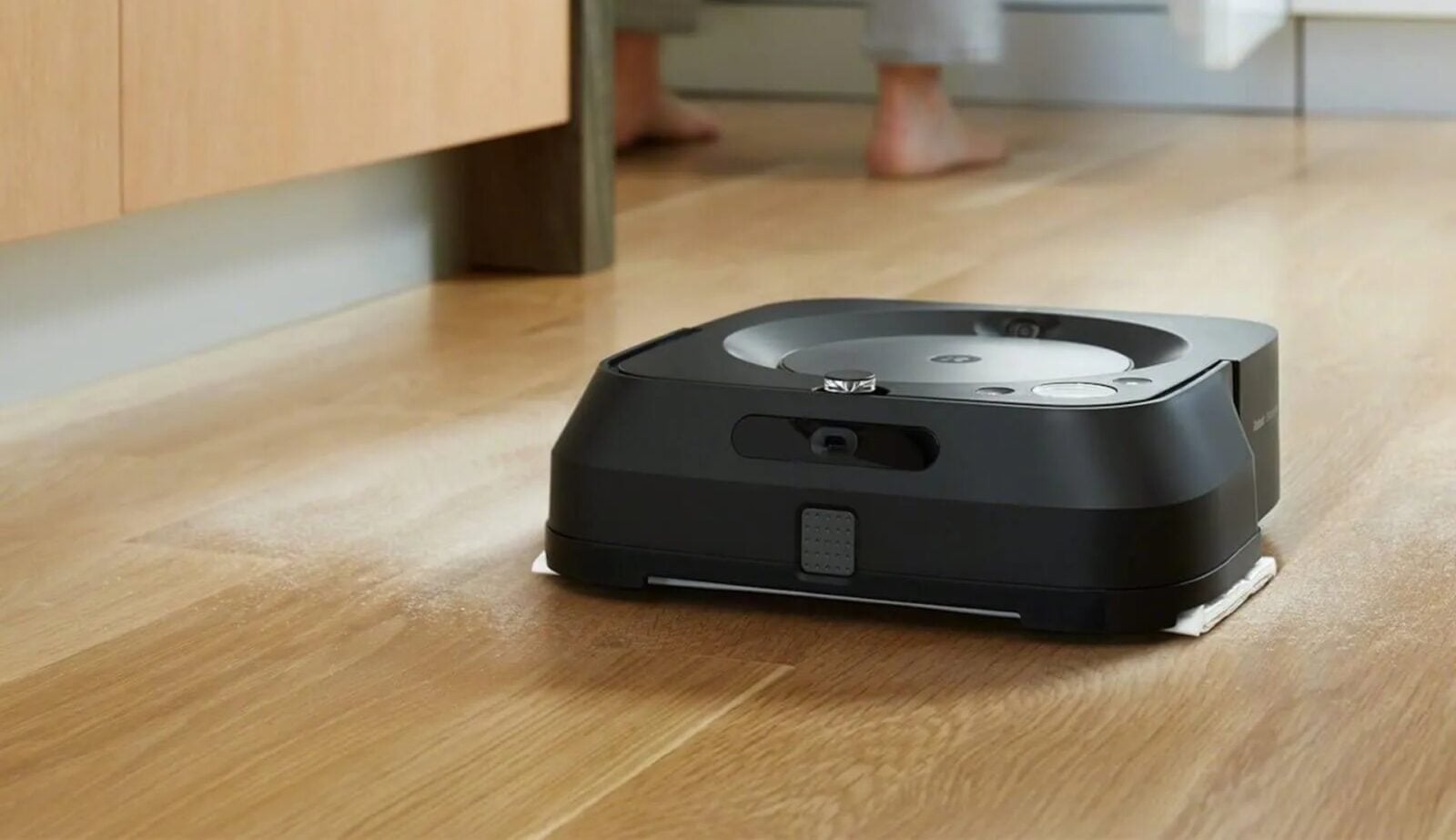 Pierwsze rozwiązanie to dedykowany robot mopujący Braava jet m6. W tym urządzeniu całkowitą uwagę poświęcono mopowaniu, co widać po dużej nakładce mopującej (w zestawie dostajemy trzy, więc nie musimy się martwić ich brakiem) oraz powiększonym spryskiwaczu, który tryska wodą z przodu obudowy. To zupełnie inne rozwiązanie niż nawilżanie nakładki mopującej, bo woda z detergentem wchodzi w kontakt z powierzchnią jeszcze przed wjechaniem na brudną podłogę. To pozwala na rozpuszczenie brudu lub jego zmiękczenie przed wjazdem robota w dane miejsce.