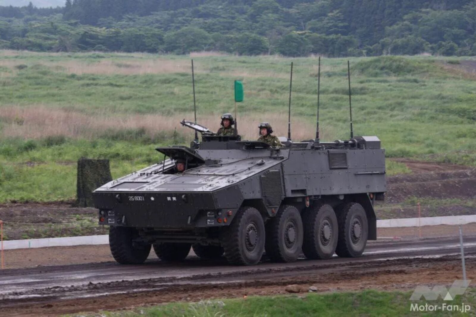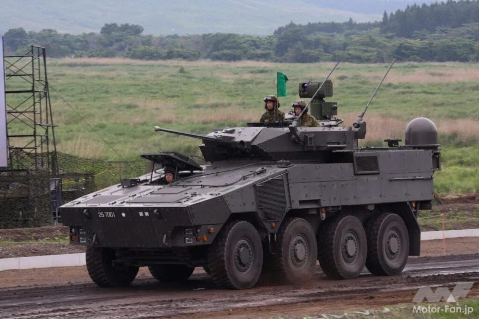 Co więc dokładnie pokazali Japończycy na paradzie Fuji Firepower 2025? Zacznijmy może od Typu 25, a więc wojskowego pojazdu rozpoznawczo-obserwacyjnego, który został zbudowany na sprawdzonej platformie 8×8 Typu 16. Ten pojazd zwiadowczy został wyposażony w łączność satelitarną i teleskopowy maszt elektrooptyczny, który może sięgać dwa razy wyżej niż sam pojazd, a do tego doczekał się uzbrojenia w działko 30 mm Mk 44 oraz karabin 7,62 mm, który jest obsługiwany przez pięcioosobową załogę. Jego cel? Zastąpić starsze pojazdy rozpoznawcze i dlatego też padło już zamówienie na 116 egzemplarzy do jednostek szybkiego reagowania.