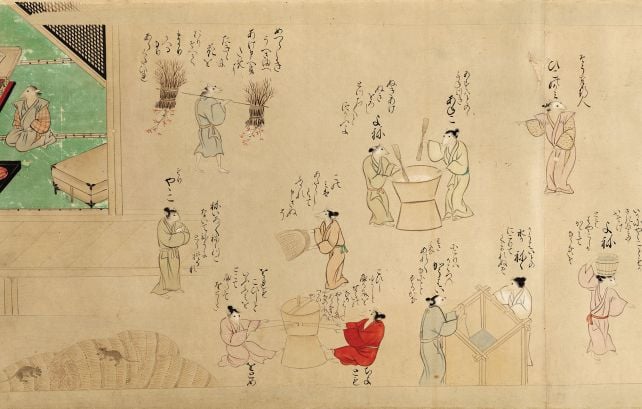 Nezumi no sōshi emaki – tak brzmi pełen tytuł wspomnianej powieści. Jej głównym bohaterem jest szczur, biegający wraz z innymi po okolicy w związku z przygotowaniami do… uczty weselnej. Trzeba przyznać, że autor tego dzieła – tworzący w okresie Muromachi, Edo bądź Azuchi-Momoyama – miał imponującą wyobraźnię.