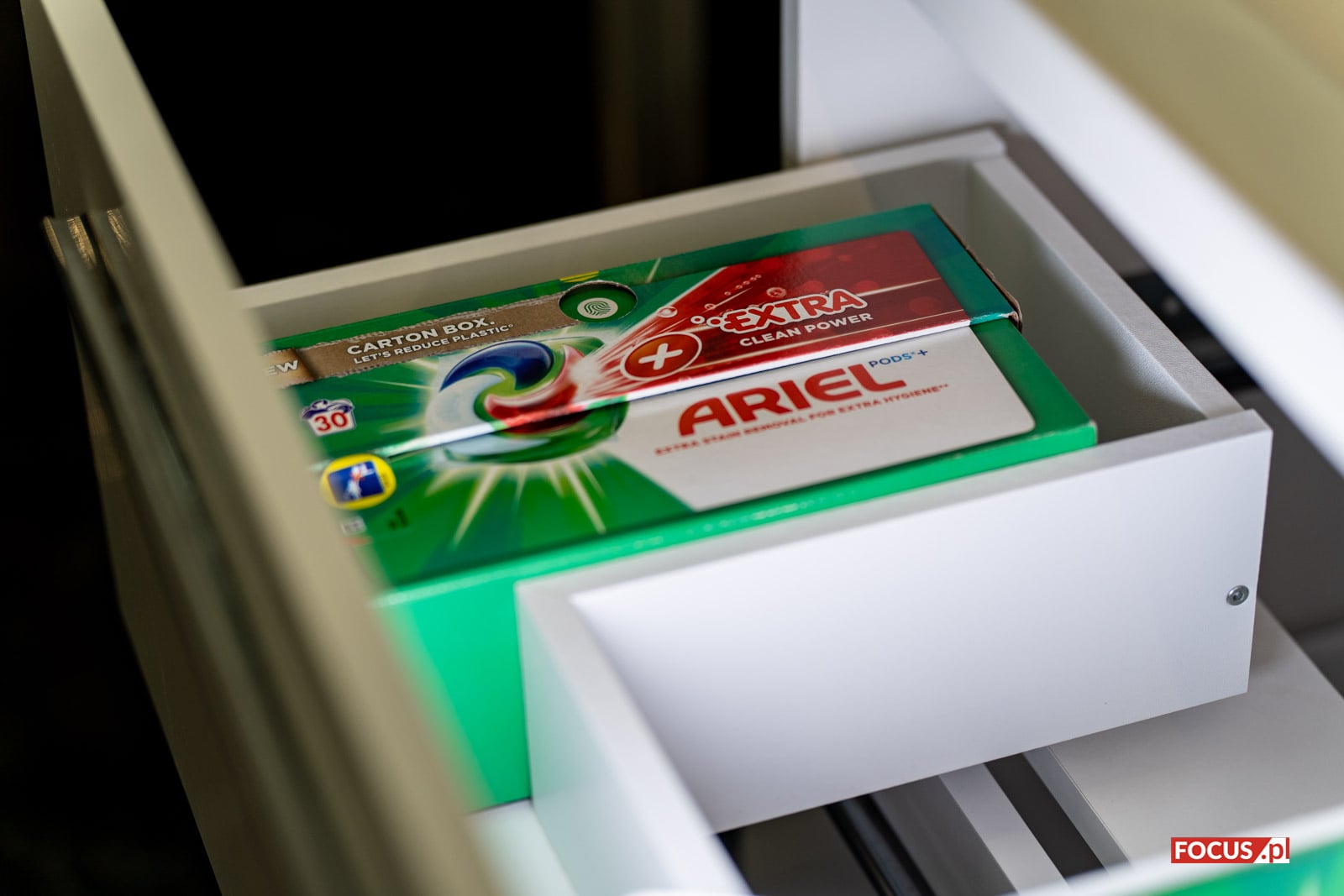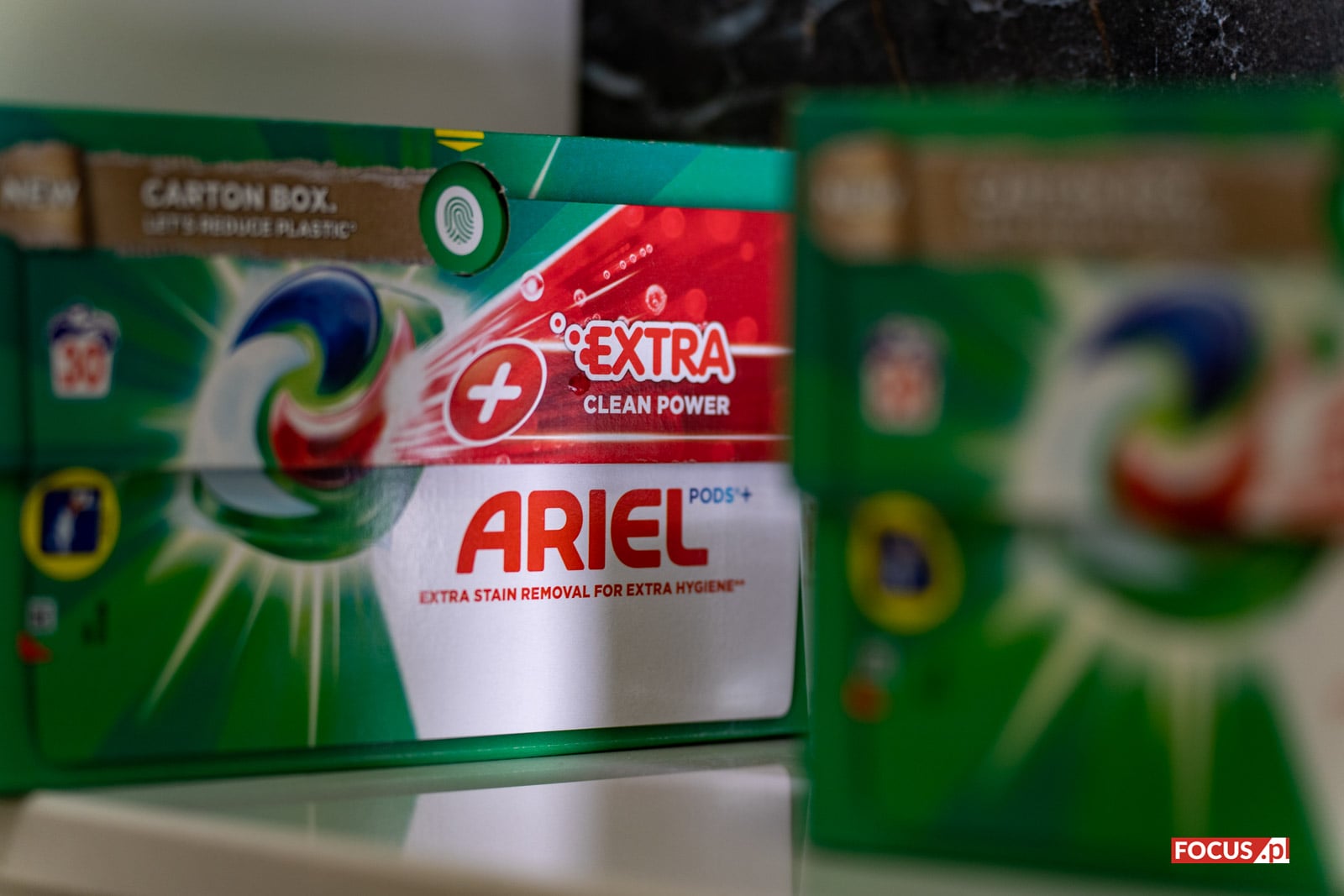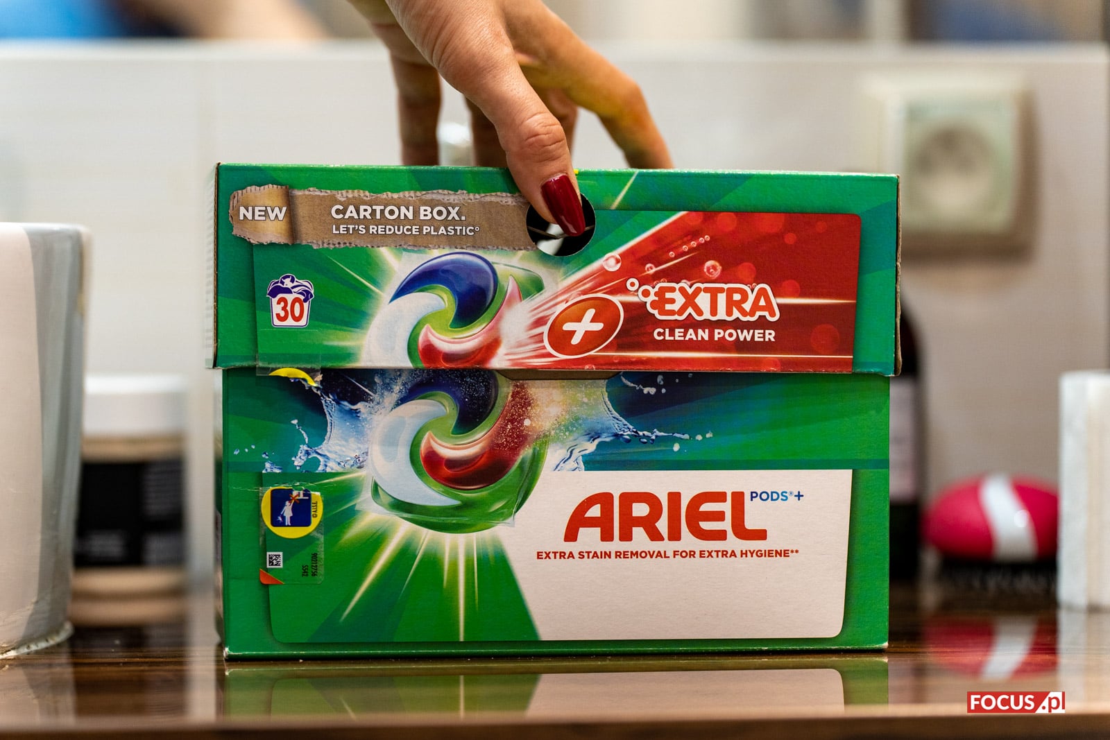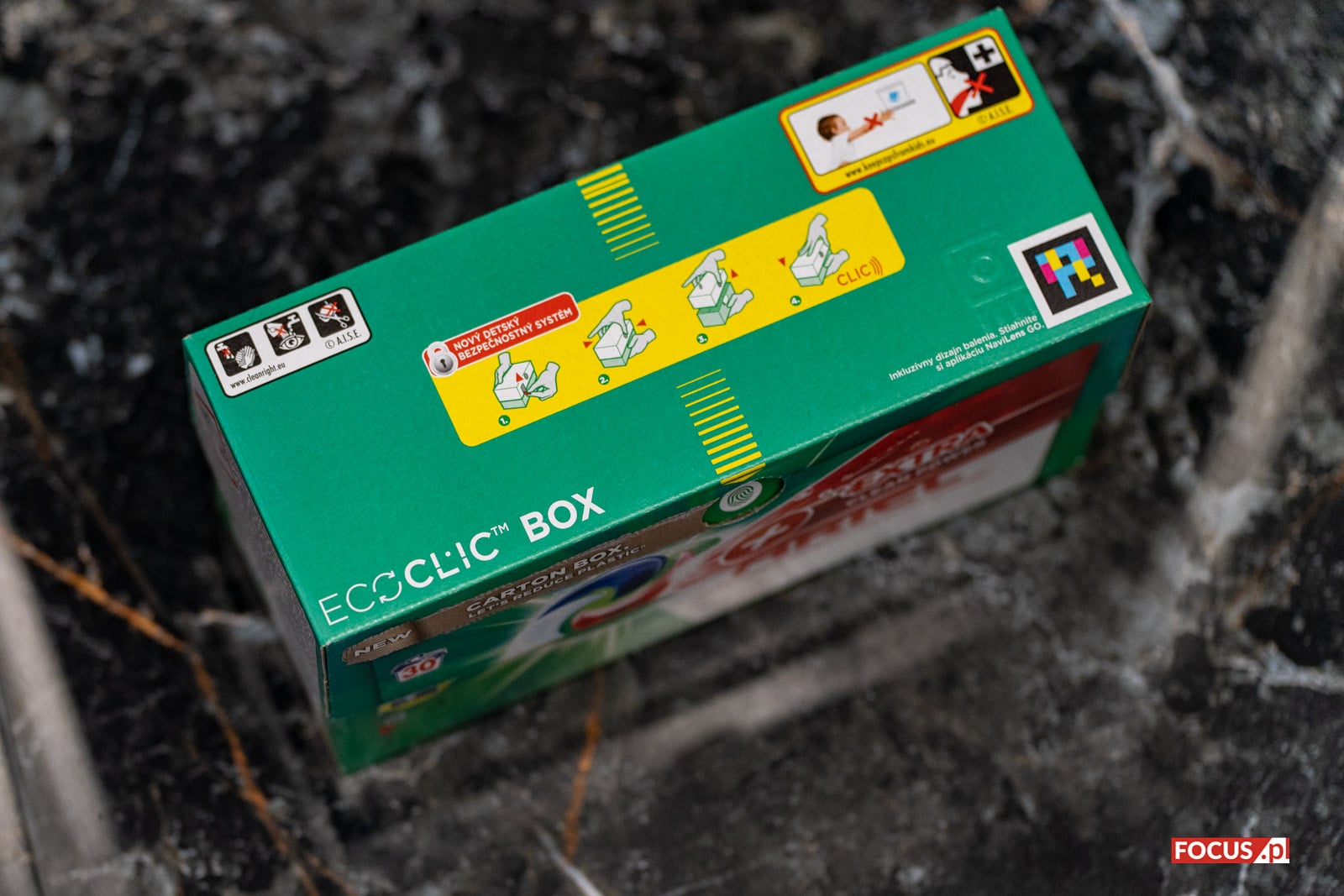 Nowe opakowanie ECOCLIC® to przede wszystkim nowy materiał. Miejsce plastikowego pudełka zajął bardziej przyjazny dla środowiska – karton. Opakowanie posiada certyfikat FSC, co oznacza, że jest wykonany z surowców pochodzących z dobrze zarządzanych lasów oraz materiałów z recyklingu. Z odzysku pochodzi ponad 70% włókien użytych do jego produkcji. Ponadto opakowanie nadaje się do ponownego przetworzenia. Z danych Procter & Gamble wynika, że jeśli każdy użytkownik kapsułek do prania Ariel PODS® zamieniłby opakowanie plastikowe na kartonowe, w całej Europie udałoby się zaoszczędzić do 6 500 ton plastiku rocznie[1].