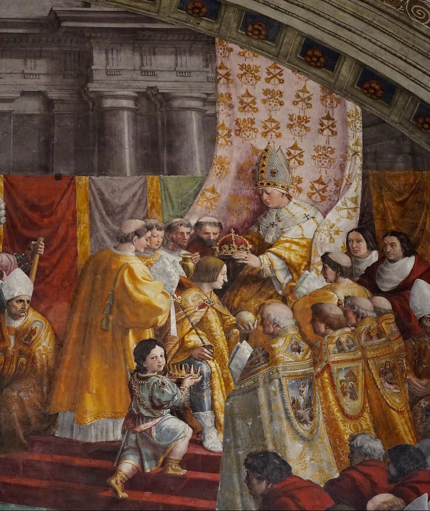 25 grudnia 800 r. w bazylice św. Piotra papież nałożył cesarską koronę na głowę króla Franków. Następnie padł przed nim na kolana, oddając mu hołd. Trzydzieści lat wojen i zabiegów o umocnienie Państwa Franków zostało uwieńczone tytułem najzaszczytniejszym z możliwych. A że nadał go Karolowi papież, nikt nie wątpił, że chciał tego sam Bóg.