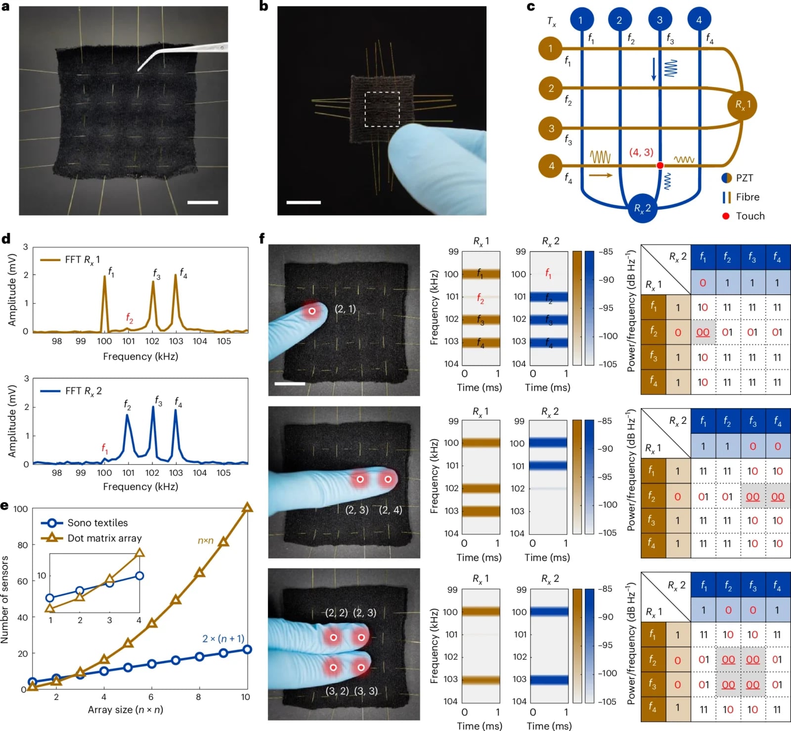 Oczywiście część garderoby uszyta z SonoTextiles będzie miała przynajmniej kilka takich nici, a więc kilka generatorów, pracujących na różnych częstotliwościach (FDMA, Frequency Division Multiple Access). Dzięki temu odbiornik może łatwo określić, na której nitce częstotliwość się zmieniła i jak. Dla komputera to banalnie proste, dzięki czemu praca z SonoTextiles nie wymaga dużej mocy obliczeniowej.