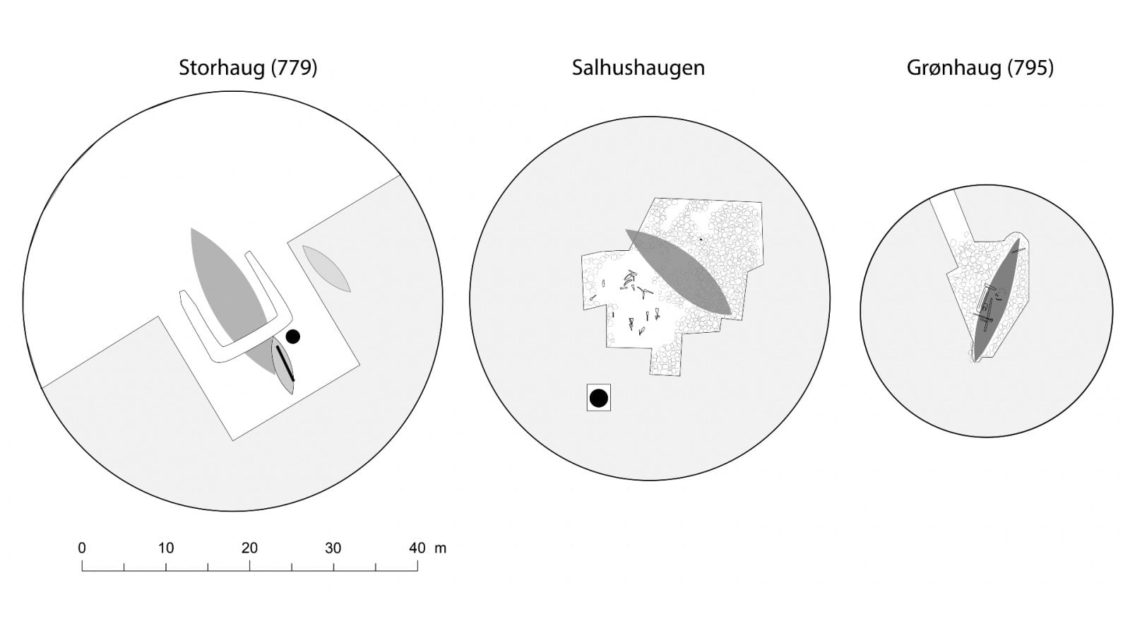 Kurhan znany jako Salhushaugen został zlokalizowany w 1906 roku, co było zasługą norweskiego archeologa Haakona Sheteliga. Ten sam poszukiwacz natrafił w okolicy na inny tego typu obiekt, zwany Grønhaug i pochodzący z 795 roku. Na tym udział Sheteliga w badaniach archeologicznych na terenie Norwegii się nie skończył, ponieważ uczestniczył on także w wykopaliskach obejmujących Oseberg z 834 roku.