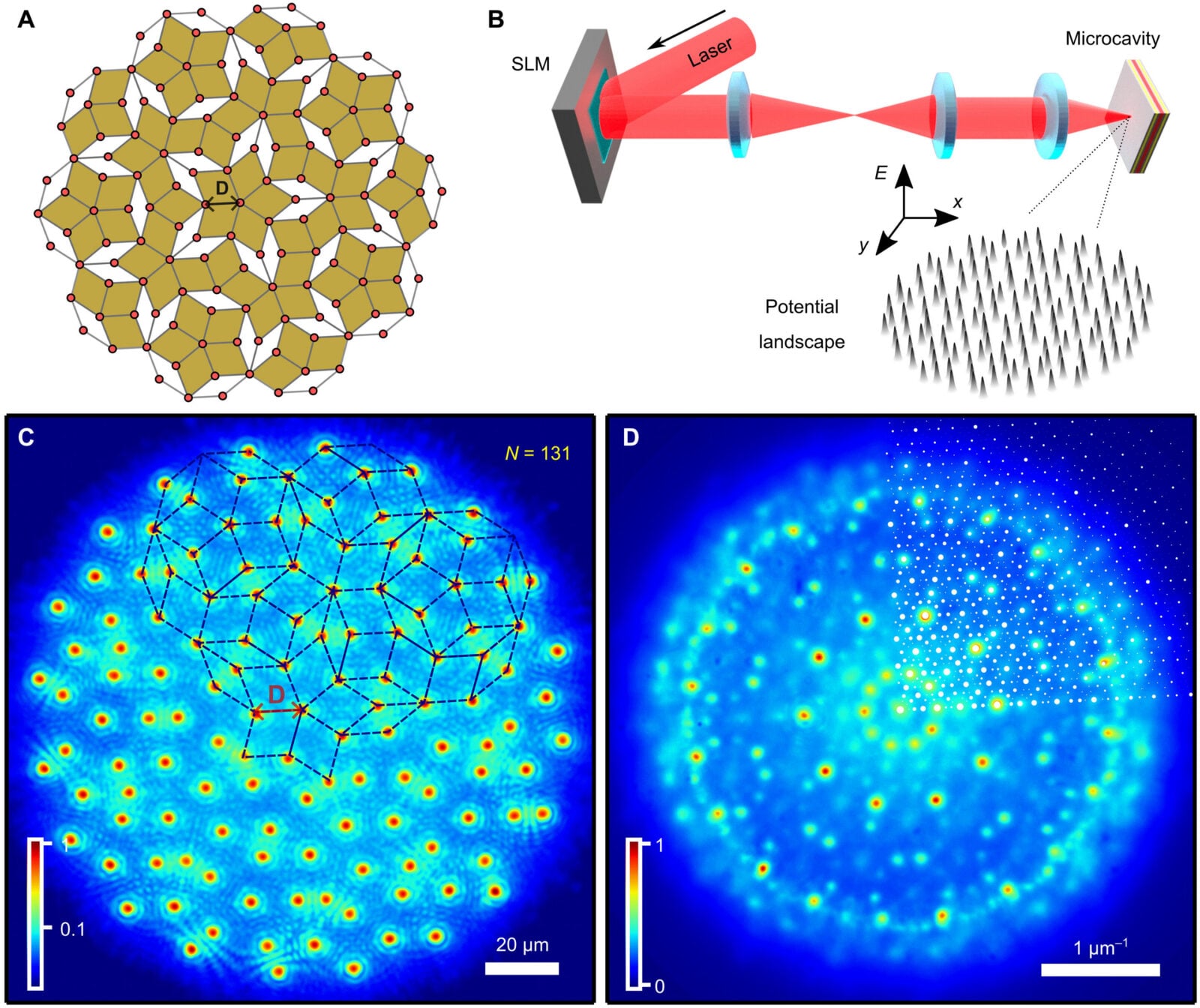 Aby stworzyć tę strukturę, badacze użyli modulatora światła przestrzennego – urządzenia, które potrafi zmieniać kształt wiązki laserowej. Za jego pomocą “narysowali” wzór Penrose’a na powierzchni półprzewodnikowej mikrownęki. Tam, w miejscach oświetlonych laserem, zaczęły tworzyć się kondensaty polarytonowe – skupiska cząstek zachowujące się jak jeden obiekt kwantowy.