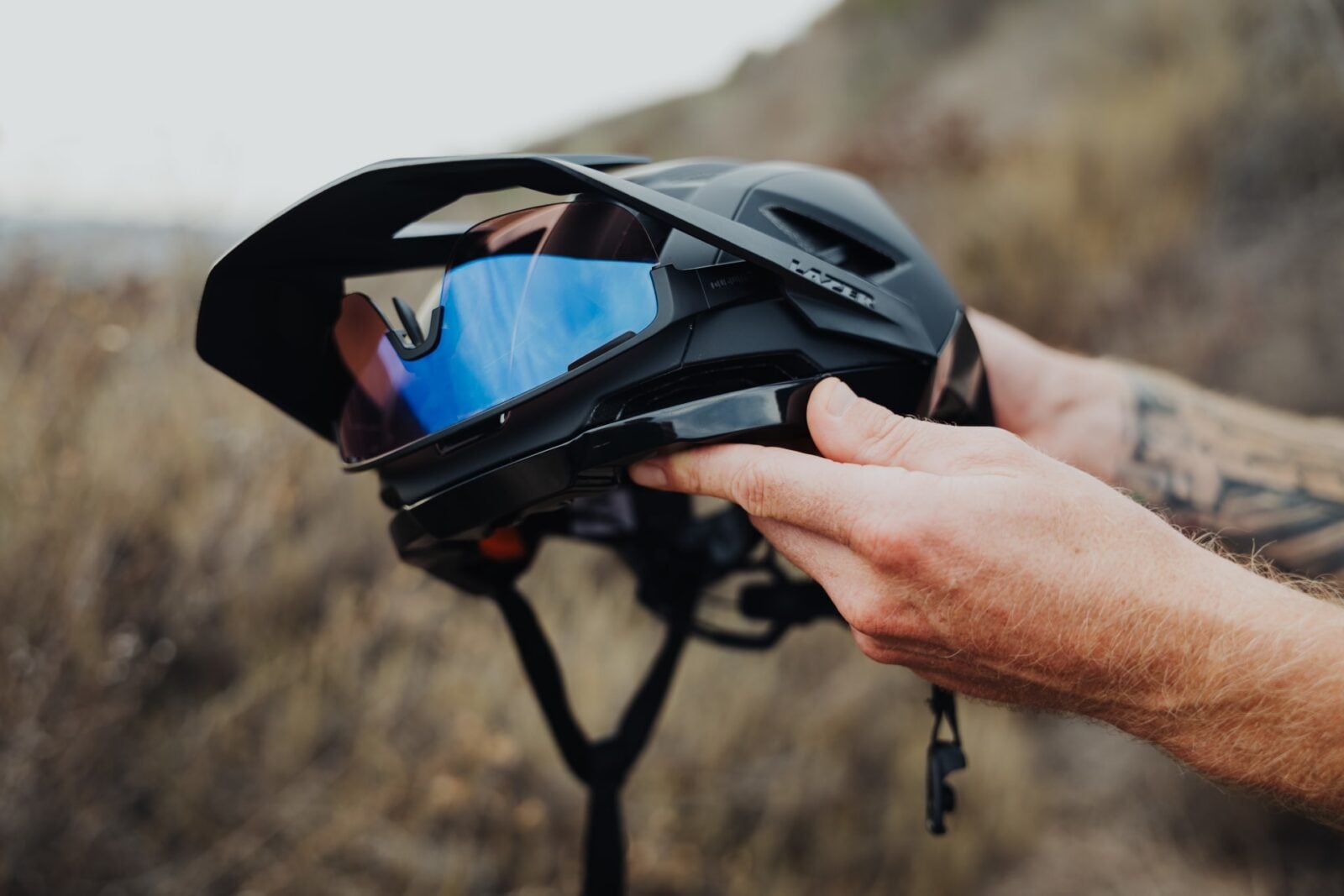 Regulowany wizjer można obsługiwać jedną ręką w trzech pozycjach – podniesionej wysoko dla gogli, opuszczonej nisko dla ochrony przed słońcem lub w pozycji środkowej. Konstrukcja jest odczepiana, więc przy silnym uderzeniu powinien się oddzielić, zmniejszając siły działające na szyję. Dwa najbardziej zewnętrzne otwory wentylacyjne po bokach służą do mocowania zauszników okularów rowerowych, a z tyłu znajduje się teksturowana gumowa podkładka zapewniająca przyczepność dla paska gogli.