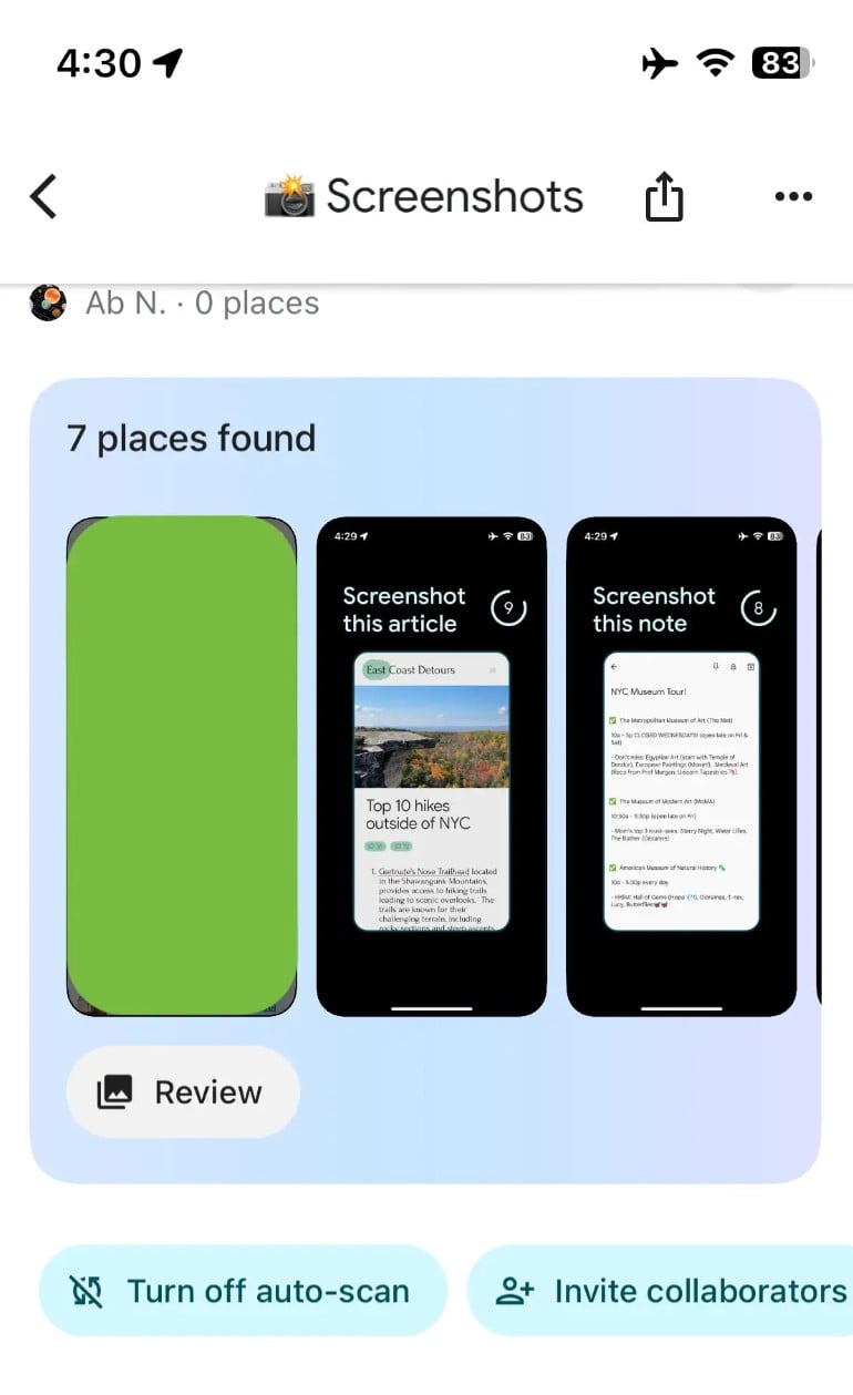 W specjalnym interfejsie “Przejrzyj” zostaną podświetlone zidentyfikowane miejsca, a my będziemy mogli wybrać opcję “Zapisz” lub “Nie zapisuj”. Zapisane lokalizacje trafią na listę “Zrzuty ekranu”, skąd będzie można je łatwo przenieść do innych kolekcji. Oczywiście ta nowość będzie dostępna tylko wtedy, gdy udzielimy jej dostępu do wszystkich zdjęć. Wówczas będzie w tle wyszukiwać nowe zrzuty ekranu zawierające lokalizacje i wyświetlać je w karuzeli do przeglądu. Alternatywnie możemy też ręcznie przeglądać swoją galerię i importować wybrane obrazy do analizy. Pod karuzelą zrzutów ekranu znajduje się wygodny przycisk “Włącz/wyłącz auto-skanowanie”.