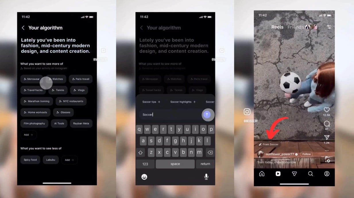 Dla Instagrama szef platformy, Adam Mosseri, zapowiedział funkcję o nazwie „Your Algorithm” (Twój Algorytm). Użytkownicy będą mogli wybrać konkretne tematy, których chcą oglądać więcej lub mniej. Ta zmiana ma być wprowadzana etapami: najpierw pojawi się w zakładce Rolki, a następnie zostanie rozszerzona na główny kanał i sekcję Odkrywaj.