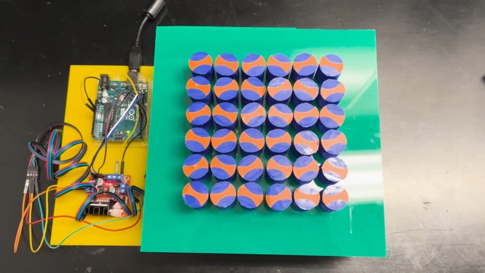Ich prototyp wygląda zdradliwie prosto. Jest to siatka z 11 na 11 pionowych filarów, z których każdy przypomina nieco ogryzek jabłka przez swoje wklęsłe boki. Każdy filar może obracać się niezależnie i jest sterowany niewielkim silnikiem elektrycznym wykonującym kroki co jeden stopień. Gdy przez taką strukturę przechodzi fala dźwiękowa, wielokrotnie odbija się od wklęsłych powierzchni. Wystarczy obrócić filary o kilka stopni, aby zmienić układ odbić i skierować energię w nowe ścieżki. Ponieważ każdy z 121 filarów może przyjąć wiele różnych kątów ustawienia, liczba możliwych wzorów rośnie w sposób kombinatoryczny i dlatego naukowcy mogą z pełnym przekonaniem twierdzić, że przestrzeń projektowa tego systemu spokojnie przekracza typowe szacunki liczby atomów we wszechświecie, rzędu 10⁸⁰.