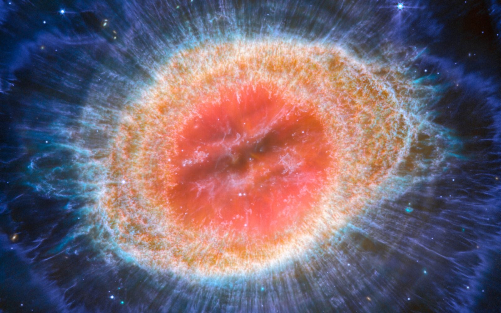Na pierwszy rzut oka wnętrze mgławicy może wydawać się pustę, jednak wcale takie nie jest. Obserwacje za pomocą kamery NIRCam wskazują, że wypełnione jest one gorącą materią gazową o stosunkowo niskiej gęstości. Wyraźny na obu zdjęciach barwny pierścień otaczający centrum kadru utworzony jest z materii odrzuconej przez umierającą gwiazdę. Teraz po gwieździe pozostał jedynie biały karzeł, który na przestrzeni wielu miliardów lat będzie stopniowo stygł, aż z czasem, w odległej przyszłości stanie się czarnym karłem.