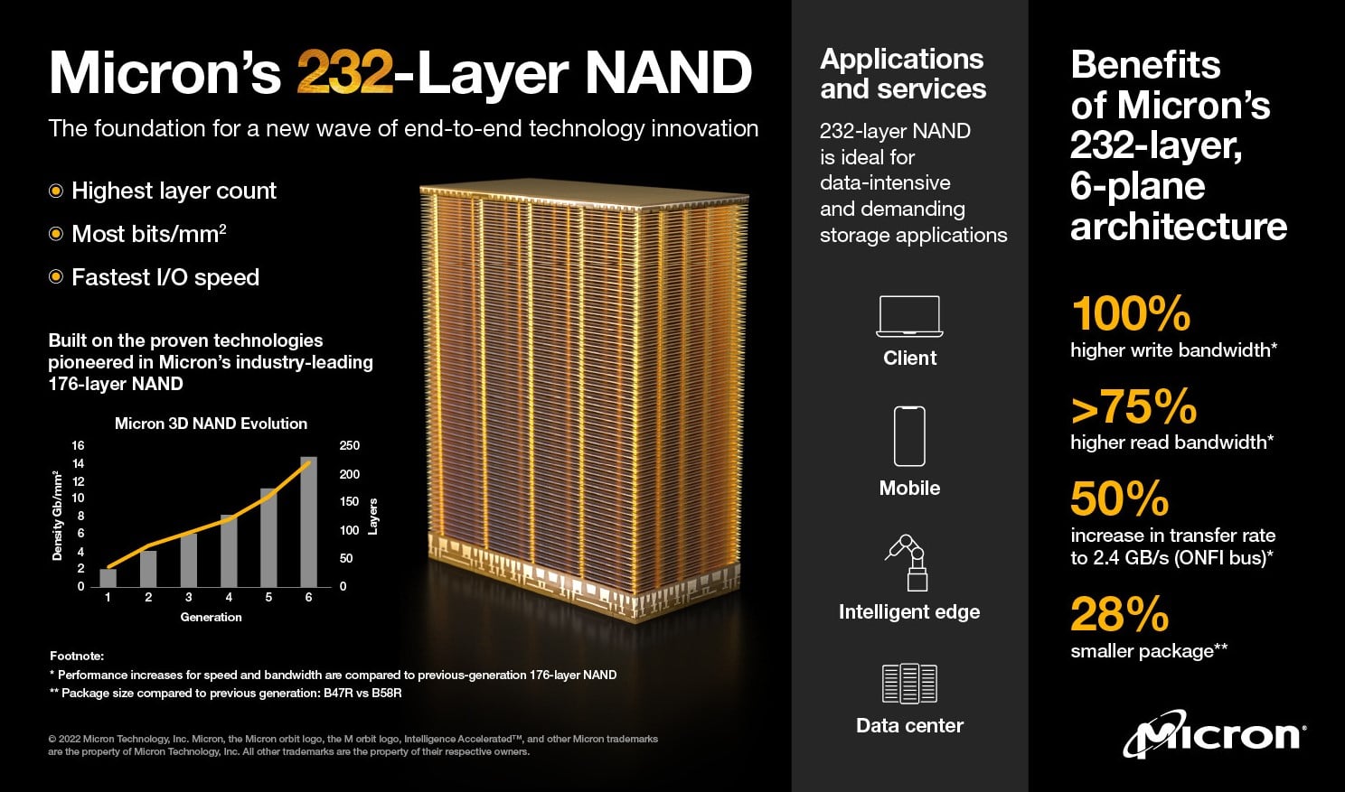 Układy pamięci Universal Flash Storage (UFS) 4.0, zbudowane zostały na zaawansowanej 232-warstwowej pamięci 3D NAND. Micron oferuje je w wersjach o maksymalnej pojemności do 1 terabajta (TB) i pierwsze próbki już zostały rozesłane do wybranych światowych producentów smartfonów i dostawców chipsetów.