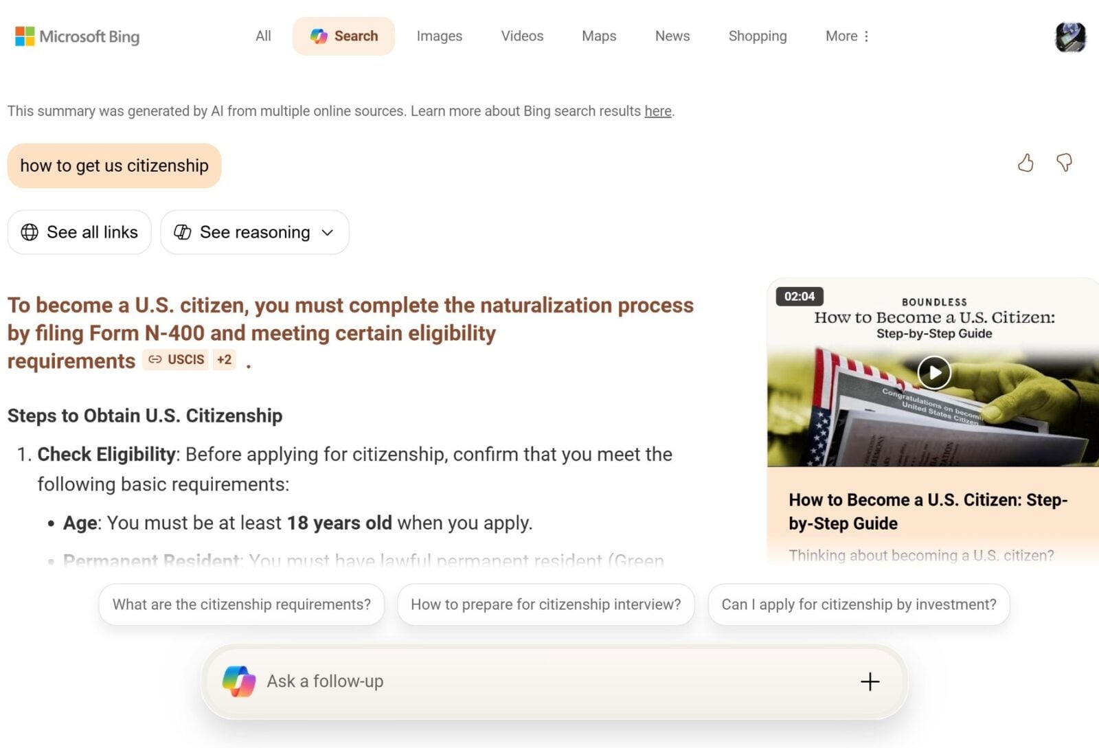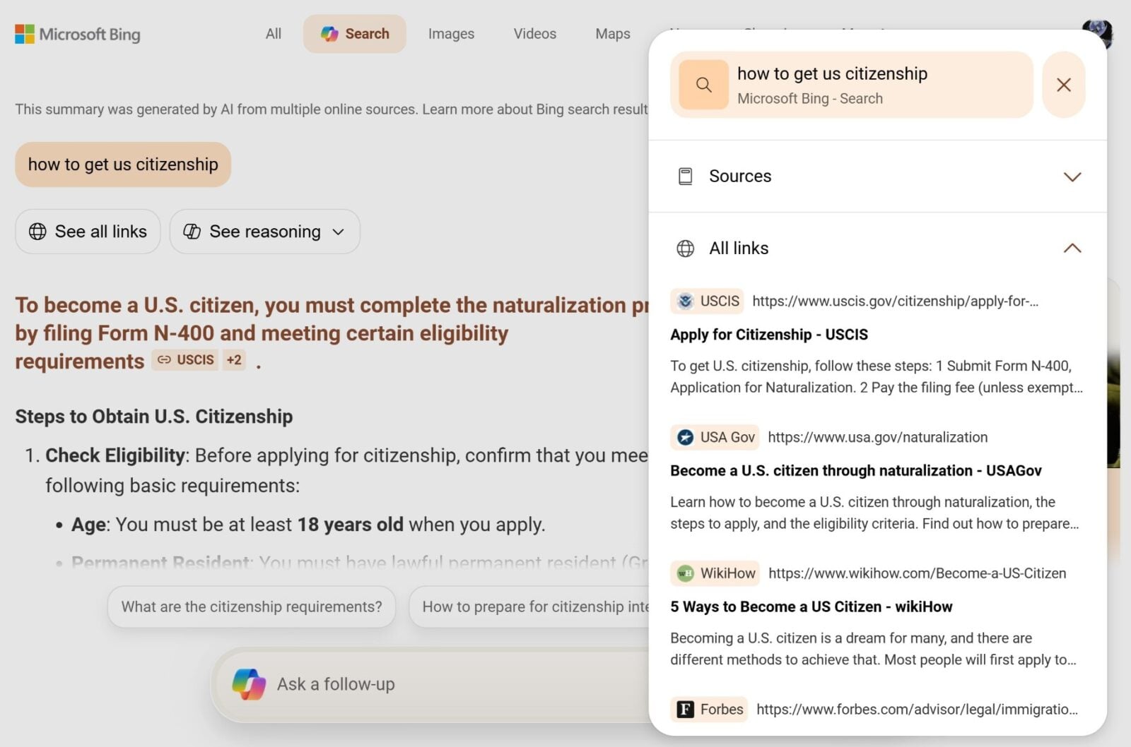 Tak, jak trybie AI wyszukiwarki Google, tutaj też możemy zadawać dodatkowe pytania, korzystając z pola tekstowego, które jest stale widoczne na dole ekranu. Odpowiedź na kolejne pytanie pojawia się na tej samej stronie, co umożliwia łatwe przewijanie i odniesienie się do pierwotnej odpowiedzi. Ponadto po prawej stronie Microsoft wyświetla hiperłącza do sekcji Obrazów i Wideo. Kliknięcie ich przekierowuje jednak do standardowych wyników wyszukiwania Obrazów i Wideo w Bing.
