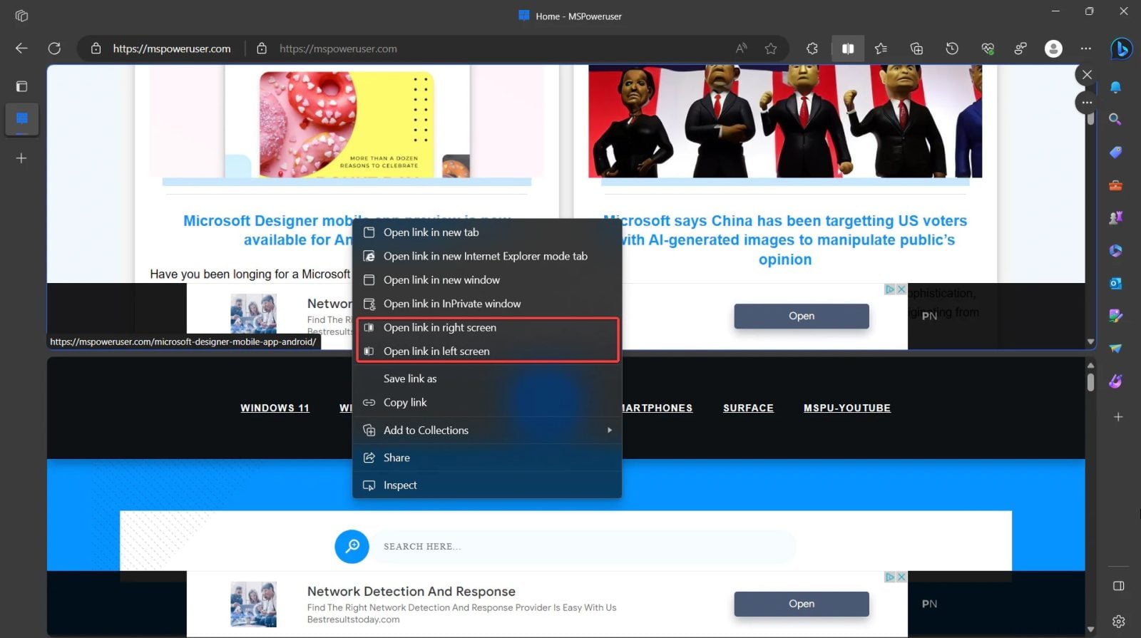 Jak zauważa insider @Leopeva64, w najnowszej kompilacji Microsoft Edge Canary można już wybrać jeden z dwóch układów: poziomy ze stronami internetowymi obok siebie i pionowy ze stosami zakładek. Użytkownik będzie mógł płynnie przełączać się pomiędzy widokami oraz zmieniać ich rozmiar, dodatkowo dostosowując wszystko do swoich preferencji. Jak widać na poniższym zrzucie ekranu, w trybie podzielonego ekranu można też wybrać, w którym miejscu na ekranie ma zostać otwarta dana strona. Microsoft zapewne jeszcze to poprawi, bo przy pionowym widoku określenia „prawe” i „lewe” mogą być trochę mylące. Warto też wspomnieć, że nowy układ podzielonego ekranu to nie jedyne ulepszenie dla tej funkcji, nad którym pracuje Microsoft. Menu „Więcej opcji” będzie wkrótce oferować dwie opcje: otwórz linki w zakładce dodatkowej lub w bieżącej.