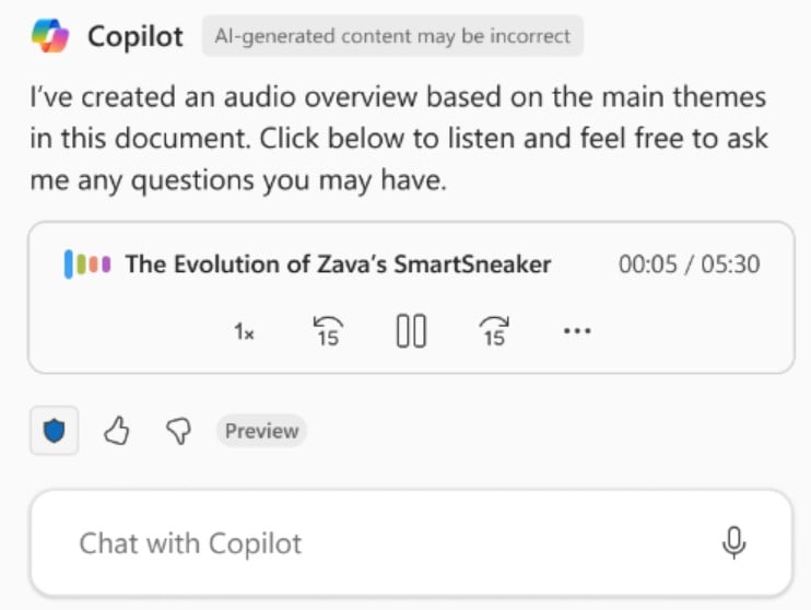 Mechanizm analizuje zawartość tekstu, wyłuskuje kluczowe wątki i przedstawia je w zwartej formie. Działa wyłącznie dla plików przechowywanych w OneDrive lub SharePoint – lokalne dokumenty na dysku nie są obsługiwane. Minimalna objętość to 100 słów, co odpowiada około pół strony A4, bo mniejszym plikom system niestety nie podoła – zresztą chyba nie byłoby nawet sensu robić tego z krótszymi tekstami. Odtwarzacz oferuje funkcje znane z aplikacji podcastowych: regulację tempa narracji, przewijanie fragmentów czy pauzowanie. Najciekawszą opcją wydaje się możliwość zapisu nagrania w OneDrive. Dzięki temu przesłuchamy podsumowanie w drodze do biura lub udostępnimy je zespołowi. Wcześniejsze wersje audio pozostają dostępne w historii czatu Copilota, więc zawsze będzie można do nich wrócić.