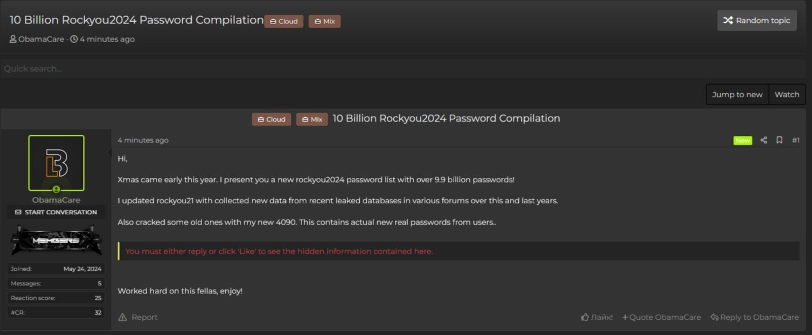 Cyberprzestępca ukrywający się pod pseudonimem „ObamaCare” opublikował na jednym z for Hamerskich największą dotychczas kompilację haseł. Plik nazwany „rockyou2024.txt” zawiera dokładnie 9 948 575 739. Tak, prawie 10 miliardów haseł. To bardzo przerażający rekord, bo tak naprawdę ofiarą mógł paść każdy z nas. Tym samym pobito poprzedni rekord należący do bazy danych „RockYou2021” zawierającej 8,4 mld haseł.